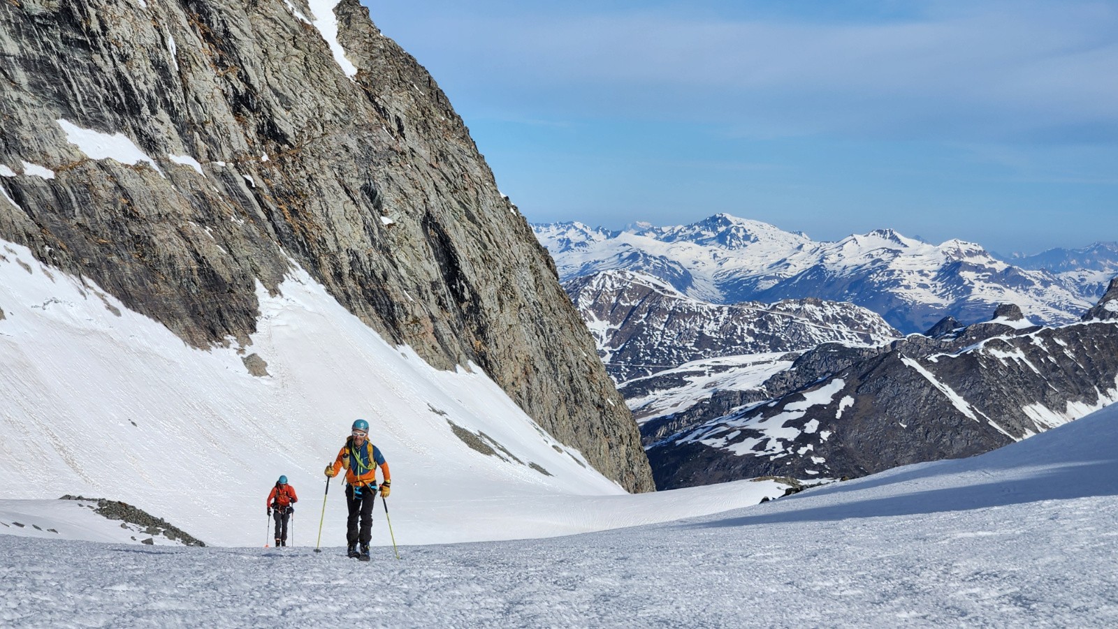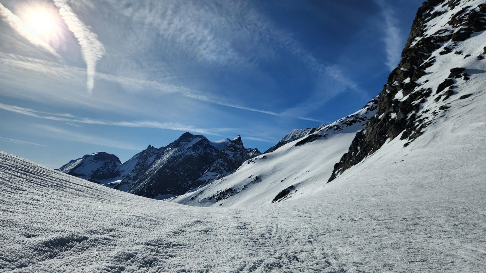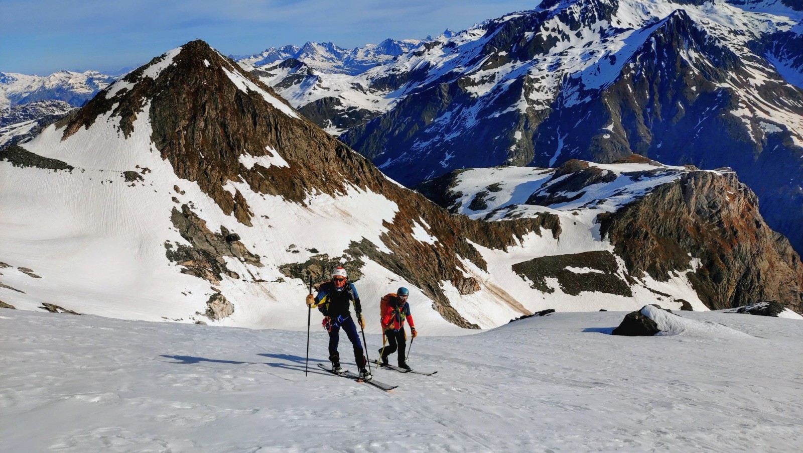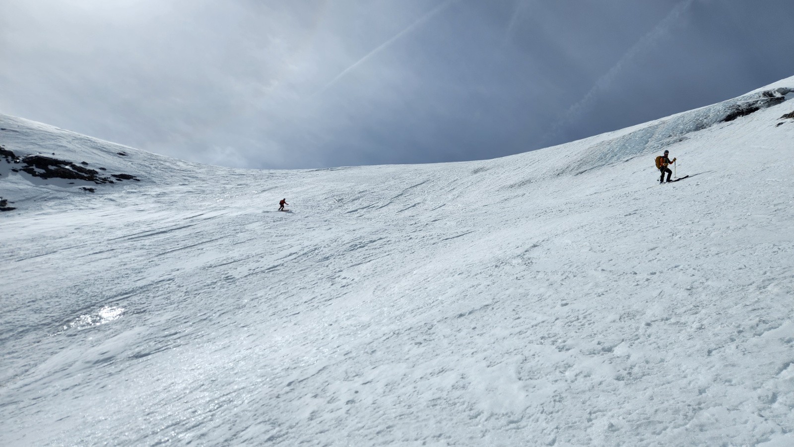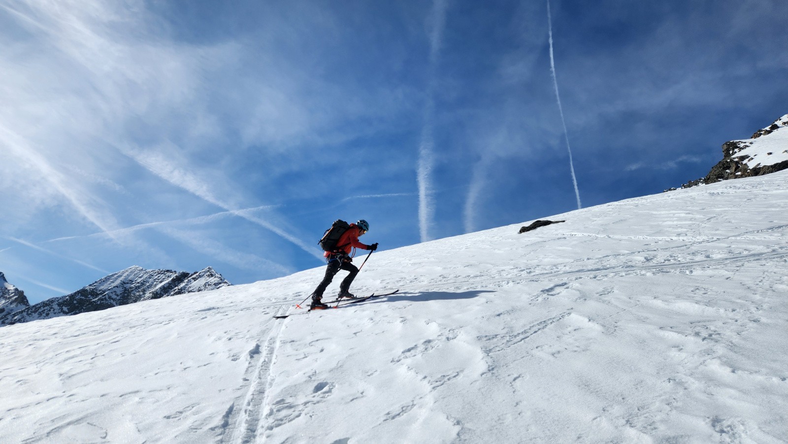 Ce matin, ça part vite. Le soleil nous réchauffe rapidement. Un aller-retour au sommet (attention à la corniche). Belle descente. Dans la partie la plus raide, le sluff a lissé la neige donc bien béton mais j'opte pour une grand traversée pour rejoindre les pentes en face bien chaudes et plus accueillantes. Au retour, je tente de trouver le passage qui permet de redescendre ski au pieds. Je pars un peu trop à gauche mais retrouve rapidement le bon passage. On insistera skis au pieds sur la neige, dans les arbres un peu à la Paul Bonhomme, la raideur et l'exposition en moins. Un bon week-end en montagne.