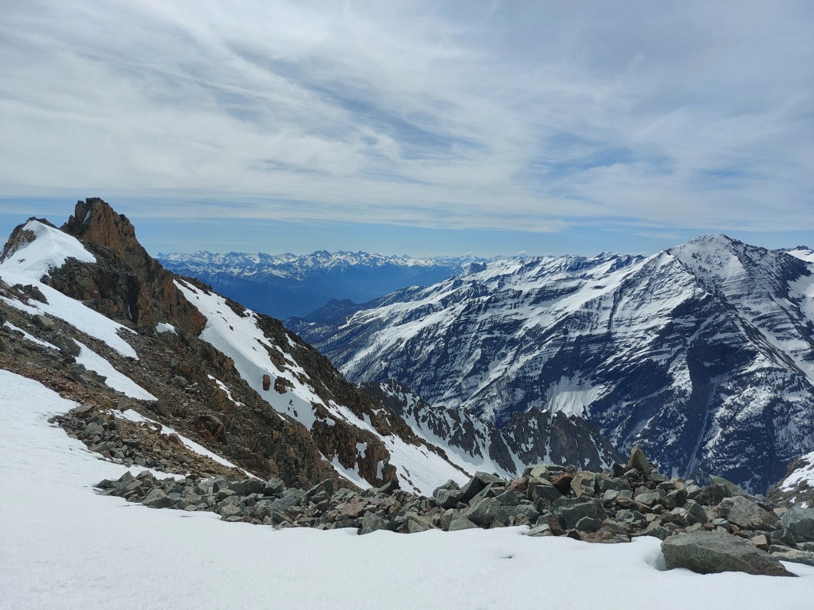 Itinéraire suivi : passerelle à l'aller et un peu galère à porter entre les blocs et les restes de neige, Bosse à droite en montant dans la ligne générale du sentier d'été