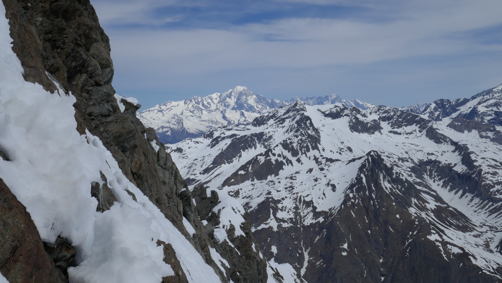 Il fait vraiment chaud, on ne sort même pas les vestes. La corniche du sommet est bien grosse. La vue grandiose, même si la neige est bien remontée en une semaine !