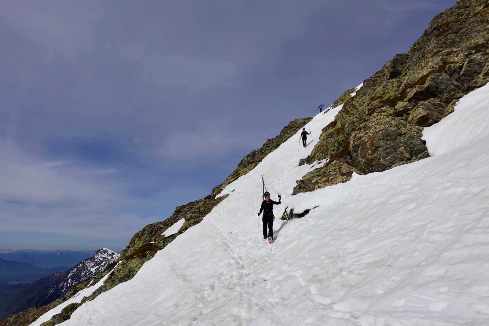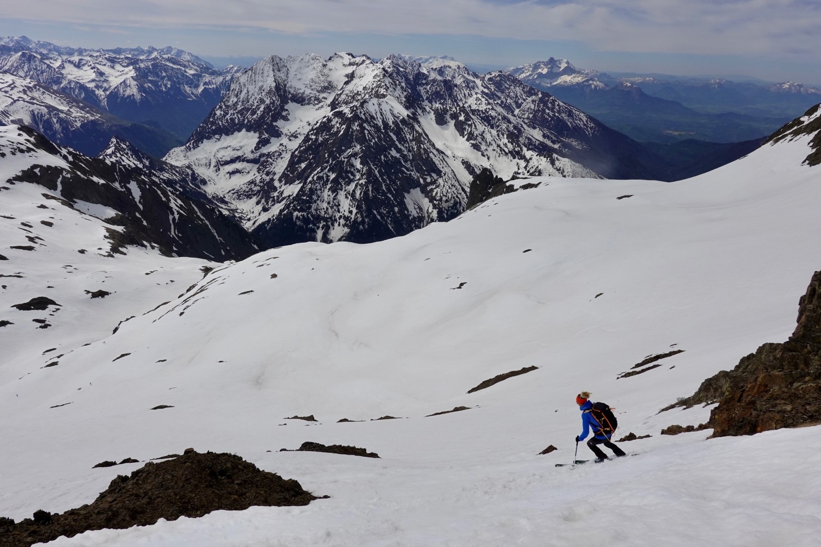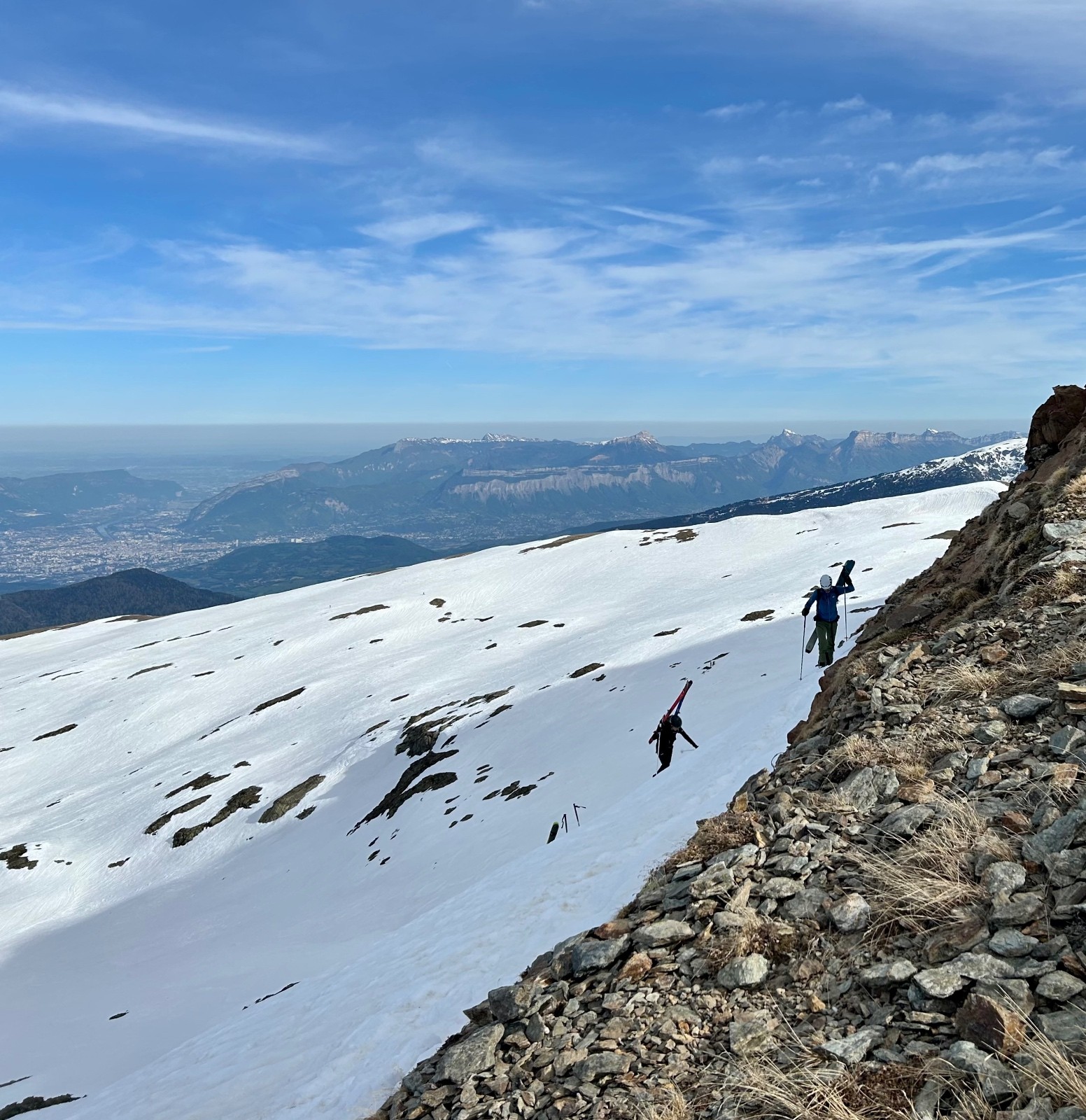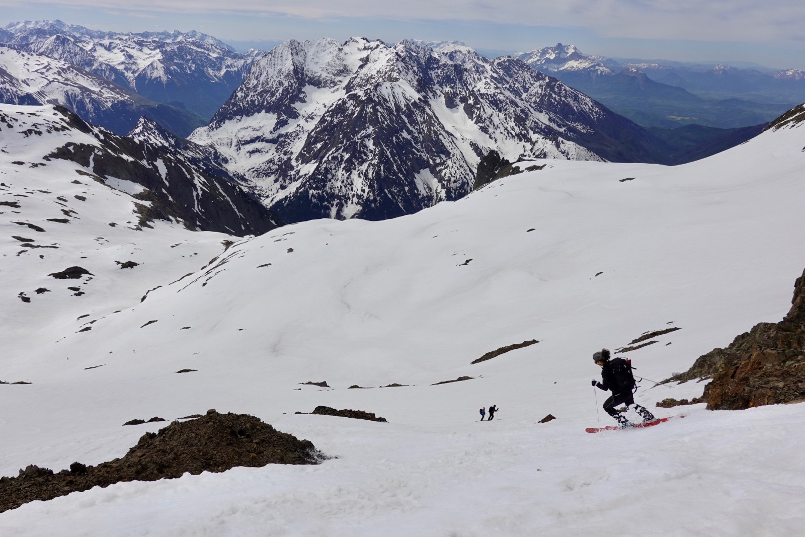 Va pour le Taillefer donc, en mode à la carte : on a convenu qu'on aviserait les pentes à skier selon les conditions, et c'est donc ce qu'on a fait : on shunte la crête de la Croix du Sergent Pinelli qui nous inspire moyen, on délaisse la Combe de l'Emay qui a trop de relief et est en partie à l'ombre, et on monte directement au Taillefer. Du sommet, la Combe des Ramays a l'air bonne, on décide de la descendre jusqu'à ce qu'on n'ait plus envie, c'est ce qu'on a fait. Et c'est une Cec très en forme qui imprime le tempo, quand on respire ça va mieux !