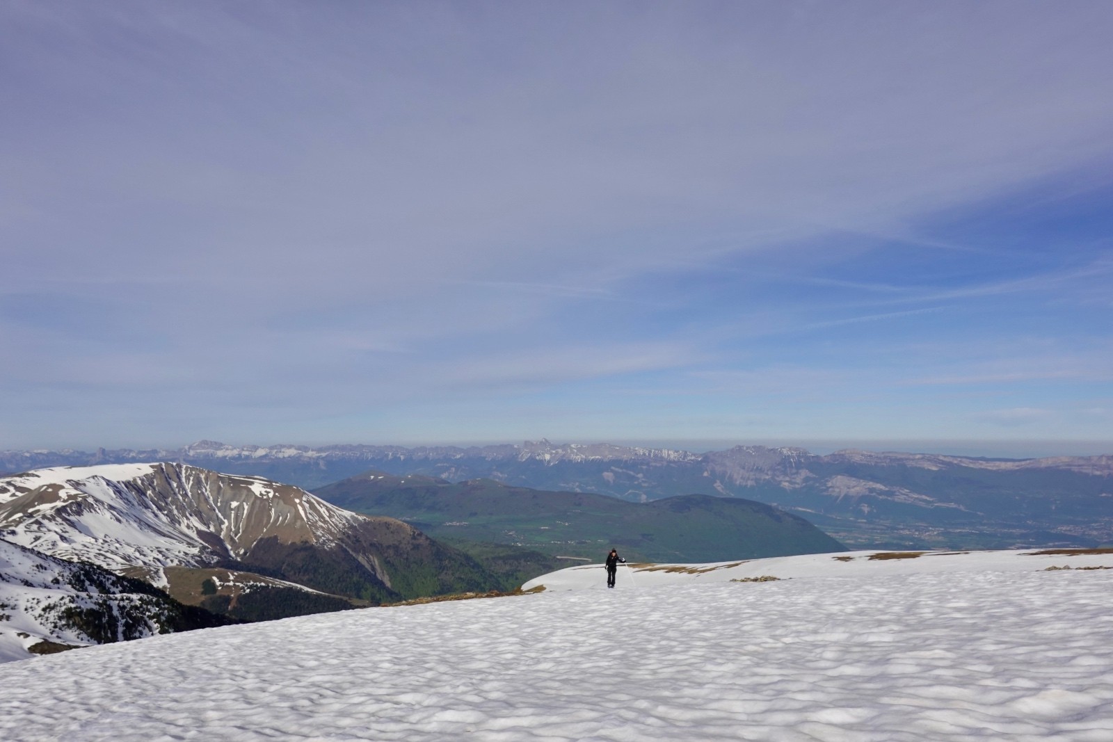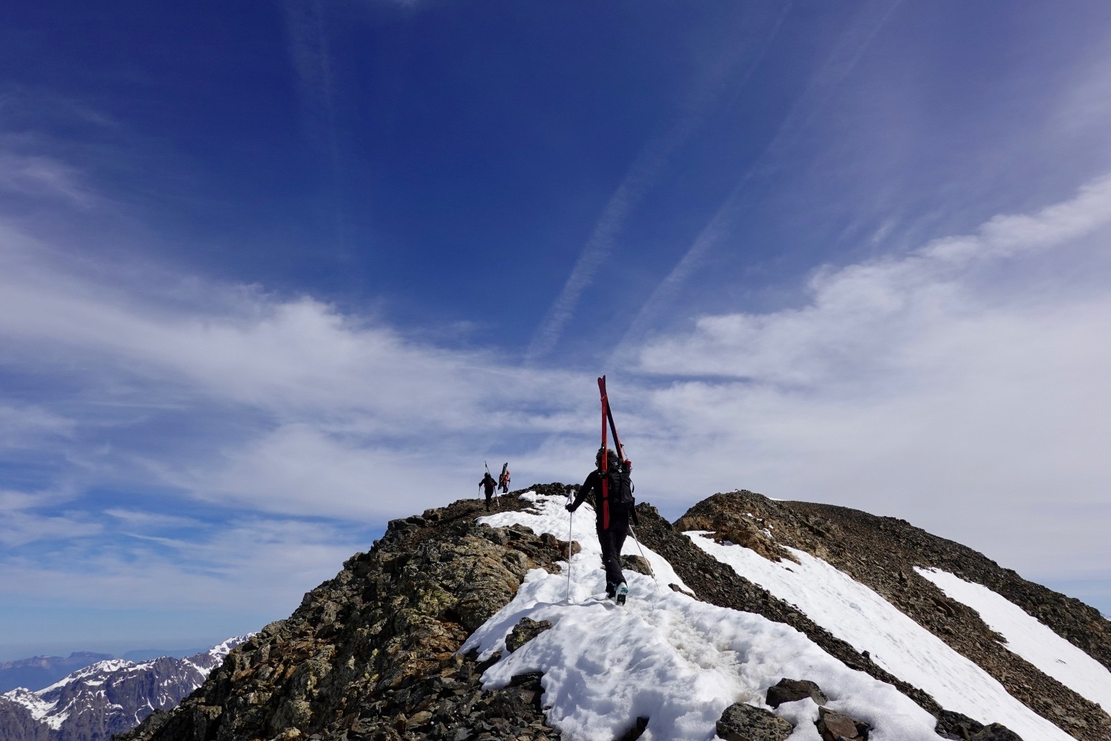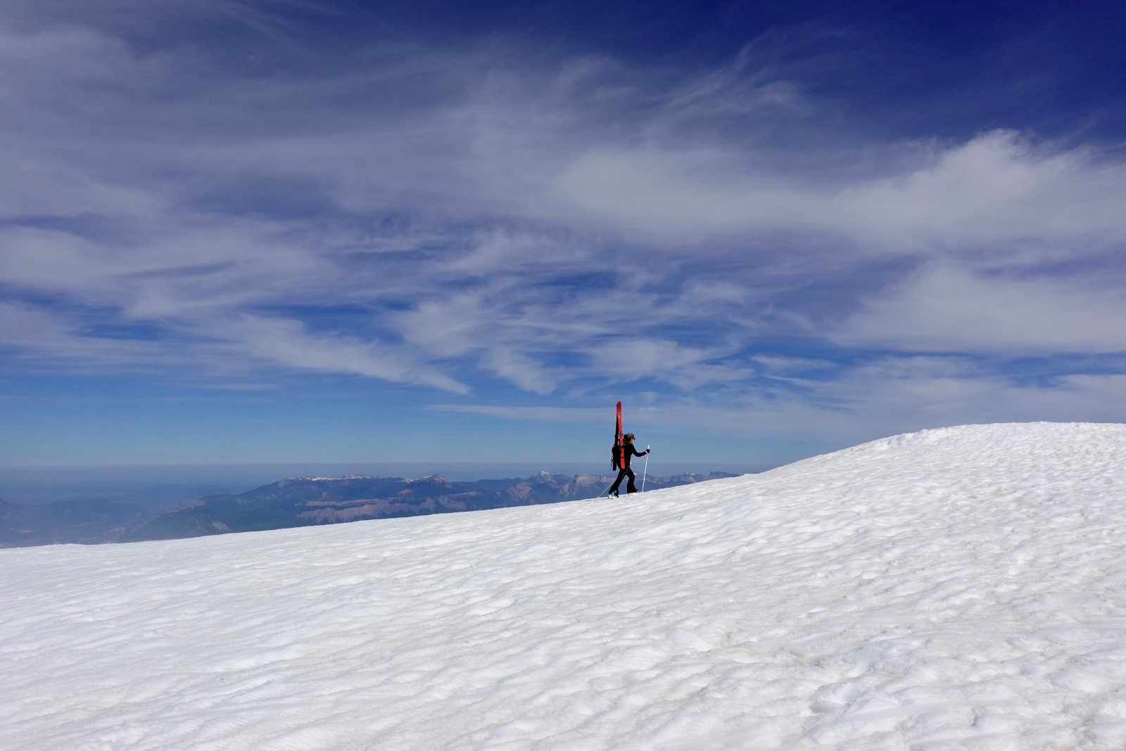 Va pour le Taillefer donc, en mode à la carte : on a convenu qu'on aviserait les pentes à skier selon les conditions, et c'est donc ce qu'on a fait : on shunte la crête de la Croix du Sergent Pinelli qui nous inspire moyen, on délaisse la Combe de l'Emay qui a trop de relief et est en partie à l'ombre, et on monte directement au Taillefer. Du sommet, la Combe des Ramays a l'air bonne, on décide de la descendre jusqu'à ce qu'on n'ait plus envie, c'est ce qu'on a fait. Et c'est une Cec très en forme qui imprime le tempo, quand on respire ça va mieux !