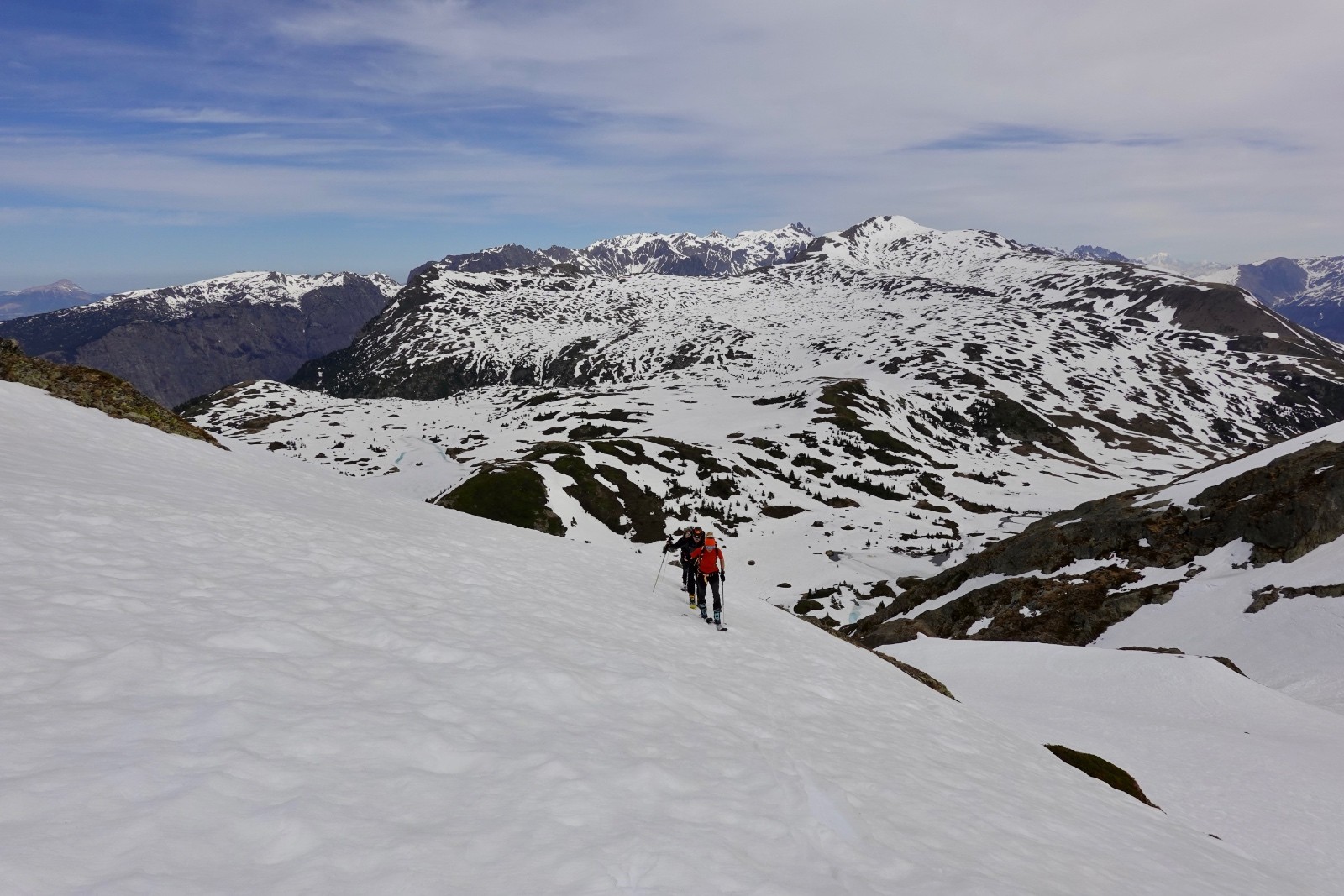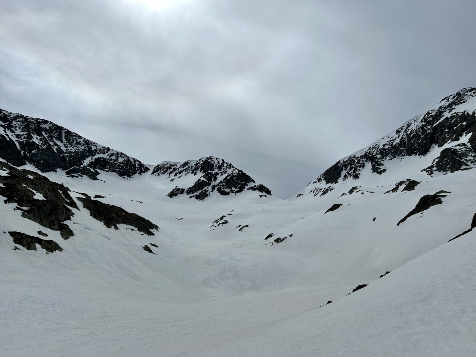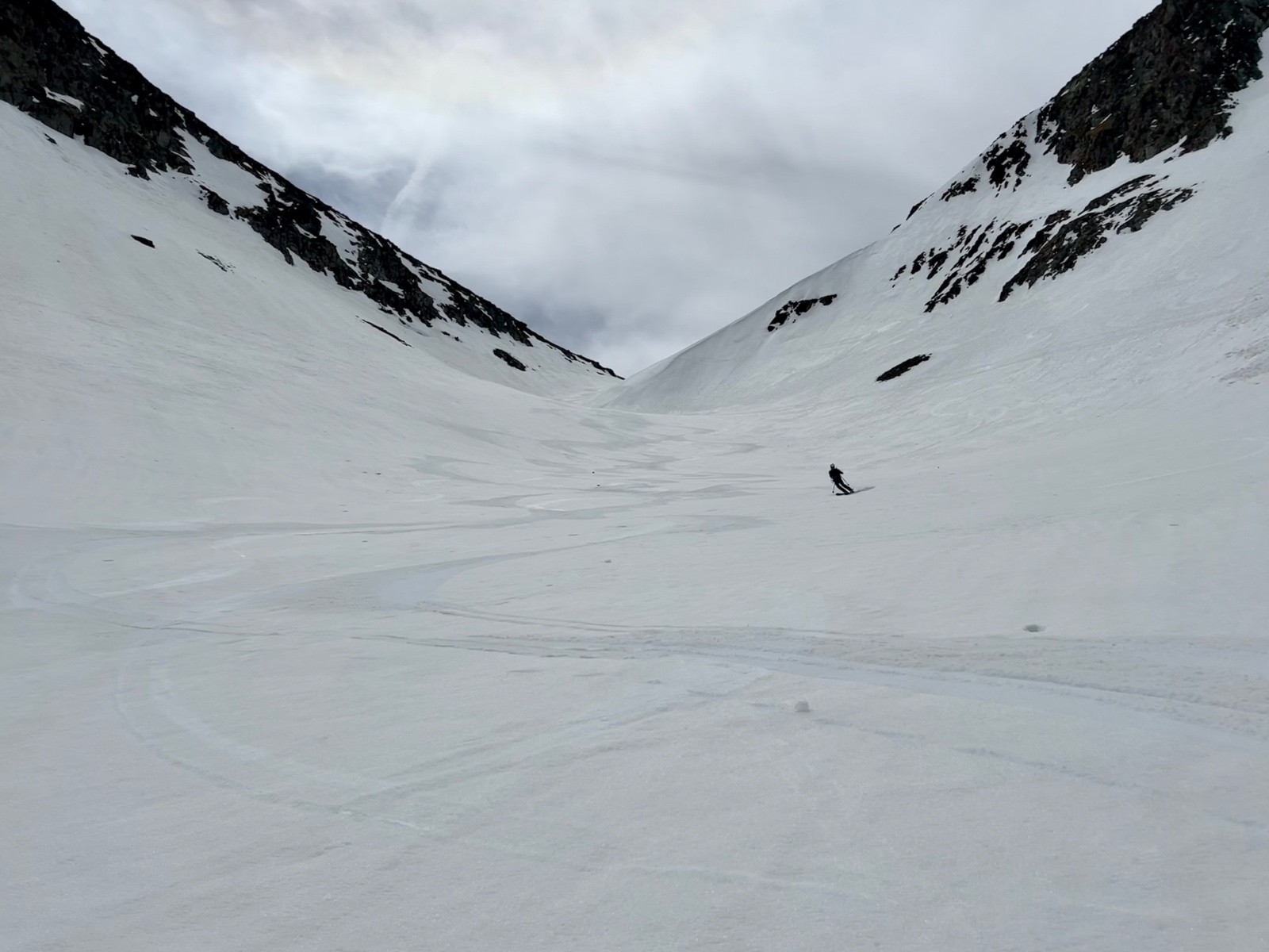 J'avais proposé sans grande conviction, du fait de son orientation, la combe au nord du Col 2619 : ce sera LA descente du jour, moquette 5*. A tel point qu'on décide de descendre au plus bas (c'est à dire jusqu'aux falaises au-dessus des lacs). Si vous suivez nos traces, pensez à ralentir à temps...