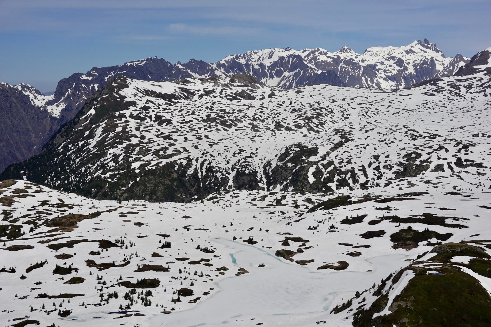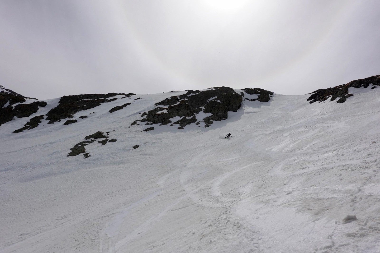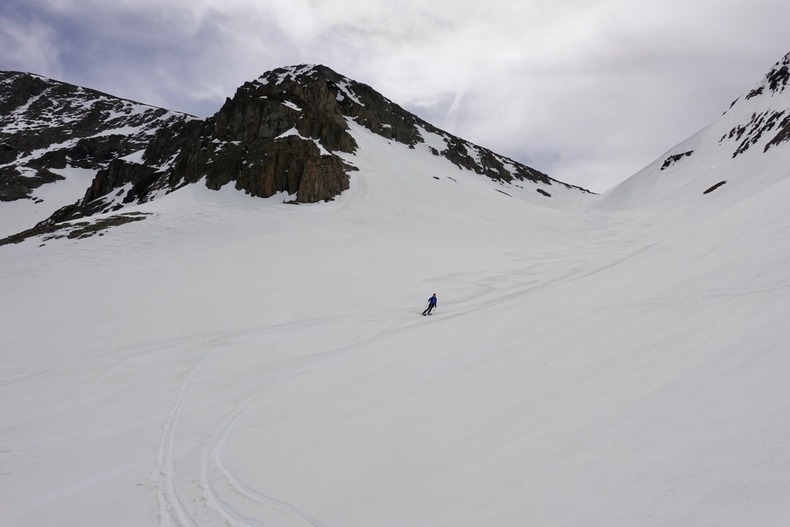 J'avais proposé sans grande conviction, du fait de son orientation, la combe au nord du Col 2619 : ce sera LA descente du jour, moquette 5*. A tel point qu'on décide de descendre au plus bas (c'est à dire jusqu'aux falaises au-dessus des lacs). Si vous suivez nos traces, pensez à ralentir à temps...