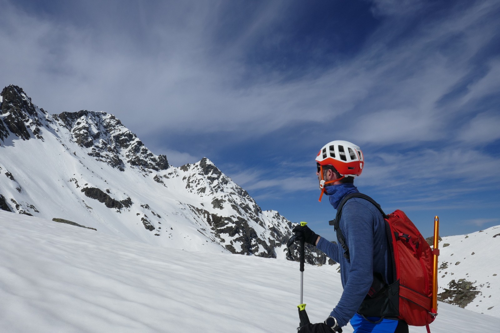 Après la magnifique sortie de la veille avec SDX, je décide de jouer à domicile cette fois-ci. Kev' venant de son Vercors passe me chercher pour un départ pas ultra matinal. On part sur le lac blanc avec l'idée d'observer ce qui nous attirera sur place. Kévin négocie un départ avec le moins de dénivelé possible en portage, ce sera donc un départ de la Souille au-dessus de Pré long. Je craignais un peu la longueur de la traversée vers le vallon, finalement ça passe plus vite. On chausse finalement peu de temps après la croisée des chemins au Pleynet vers 1500m. Finalement c'est presque plus efficace que depuis Freydières. Le Jas du Mouton est complètement sec jusqu'en haut, tout comme Orionde et l'accès au refuge Jean Collet. Les pentes raides du coin (PLD, NE de la Grande, ...) sont déjà très sèches pour le reste c'est encore bien enneigé. On passe en crampons pour passer le verrou du Lac Blanc. Au-dessus, plusieurs propositions : La SW des Excellences, N du Coutet, Rochers Rouges, tous encore en conditions. C'est finalement le col du Lac Blanc qui attire l'oeil de mon ami. Va pour cette descente alors. Je lui propose de passer par Freydane et l'arête afin de passer par le Coutet.