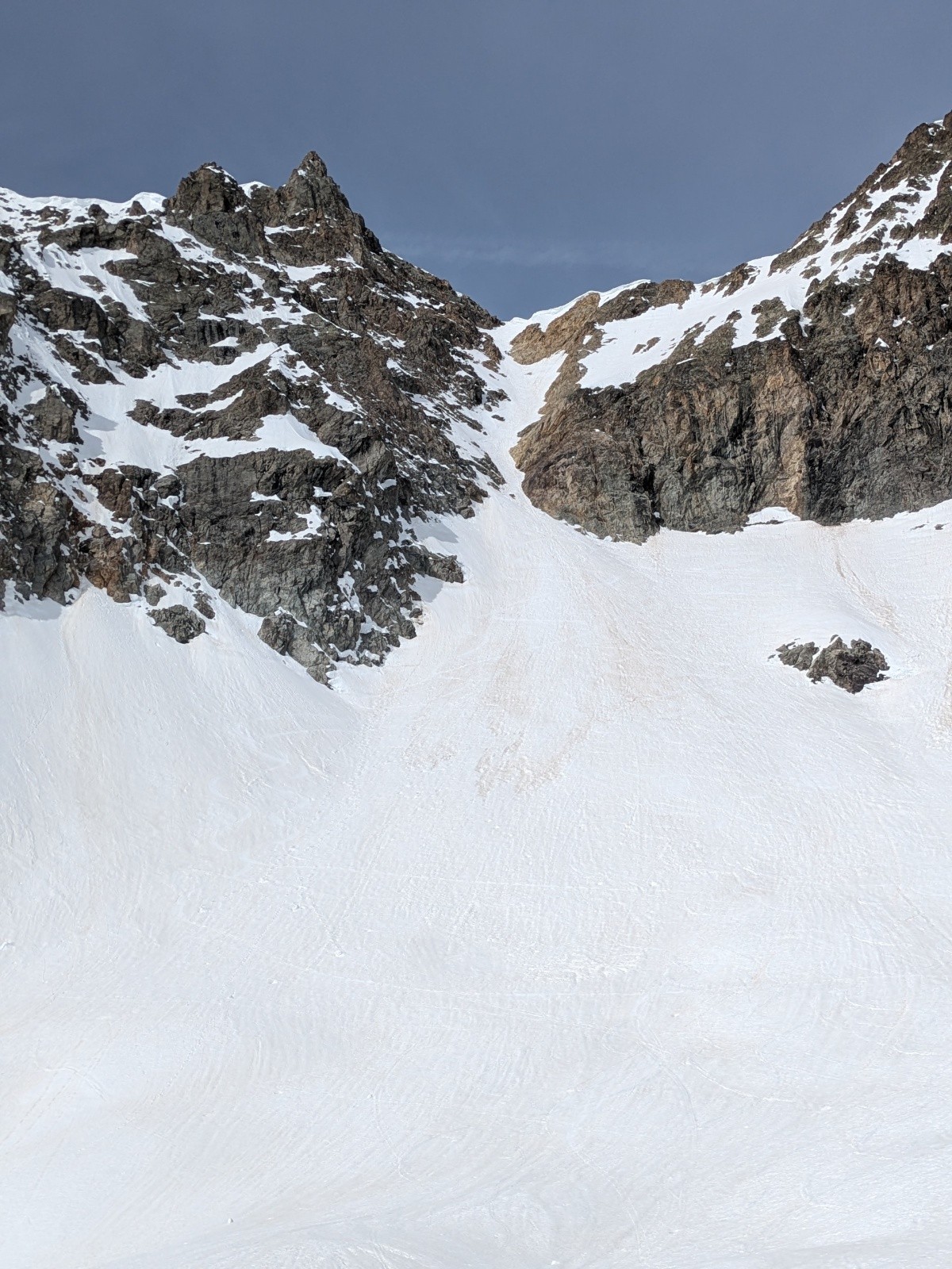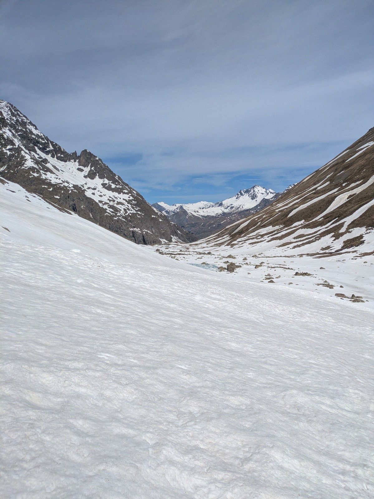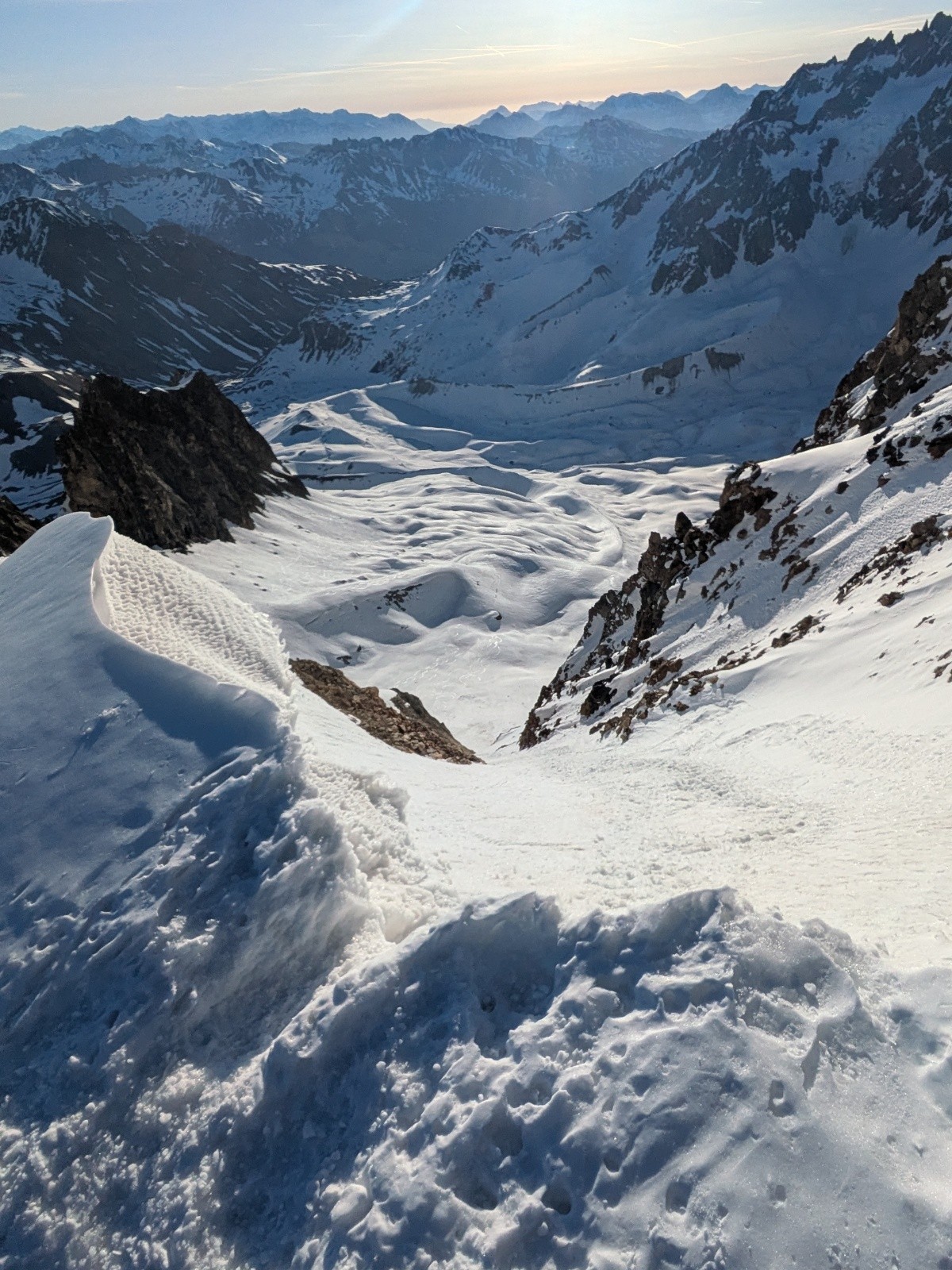 La suite est en bonne neige de printemps plus ou moins épaisse selon les expos. On arrive ski au pieds en gravitaire jusqu'au refuge, (presque) sans pousser.