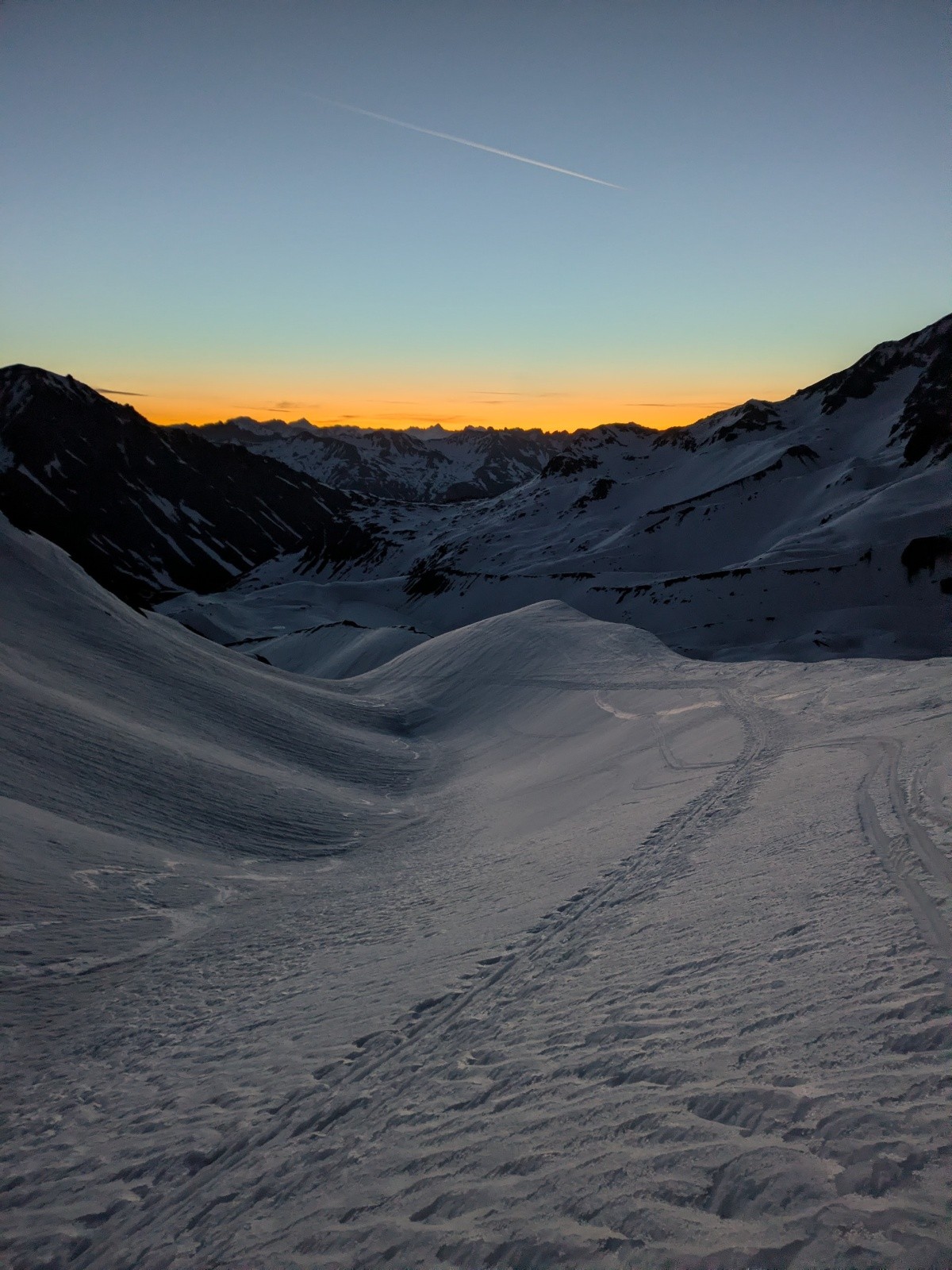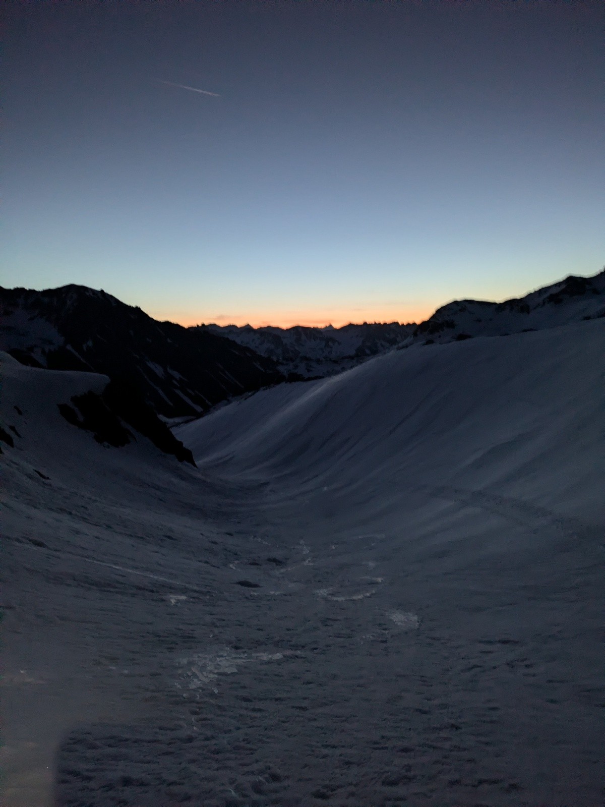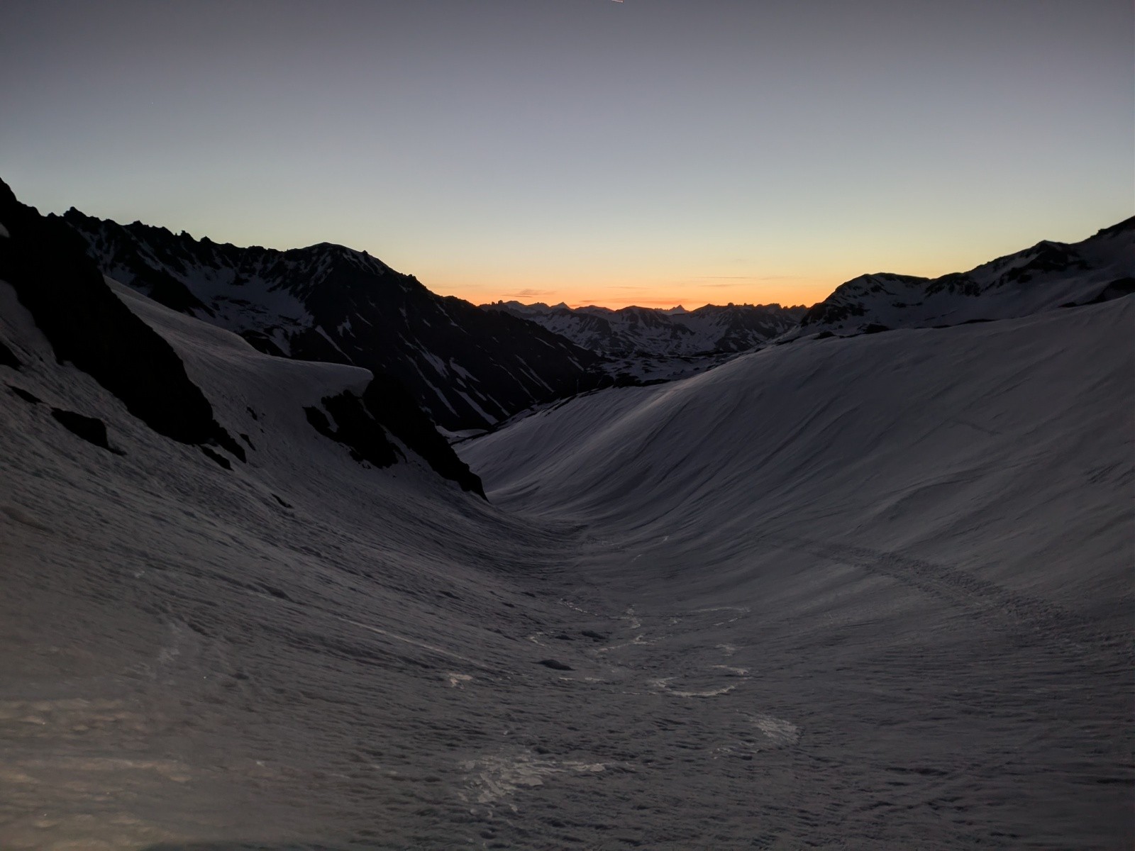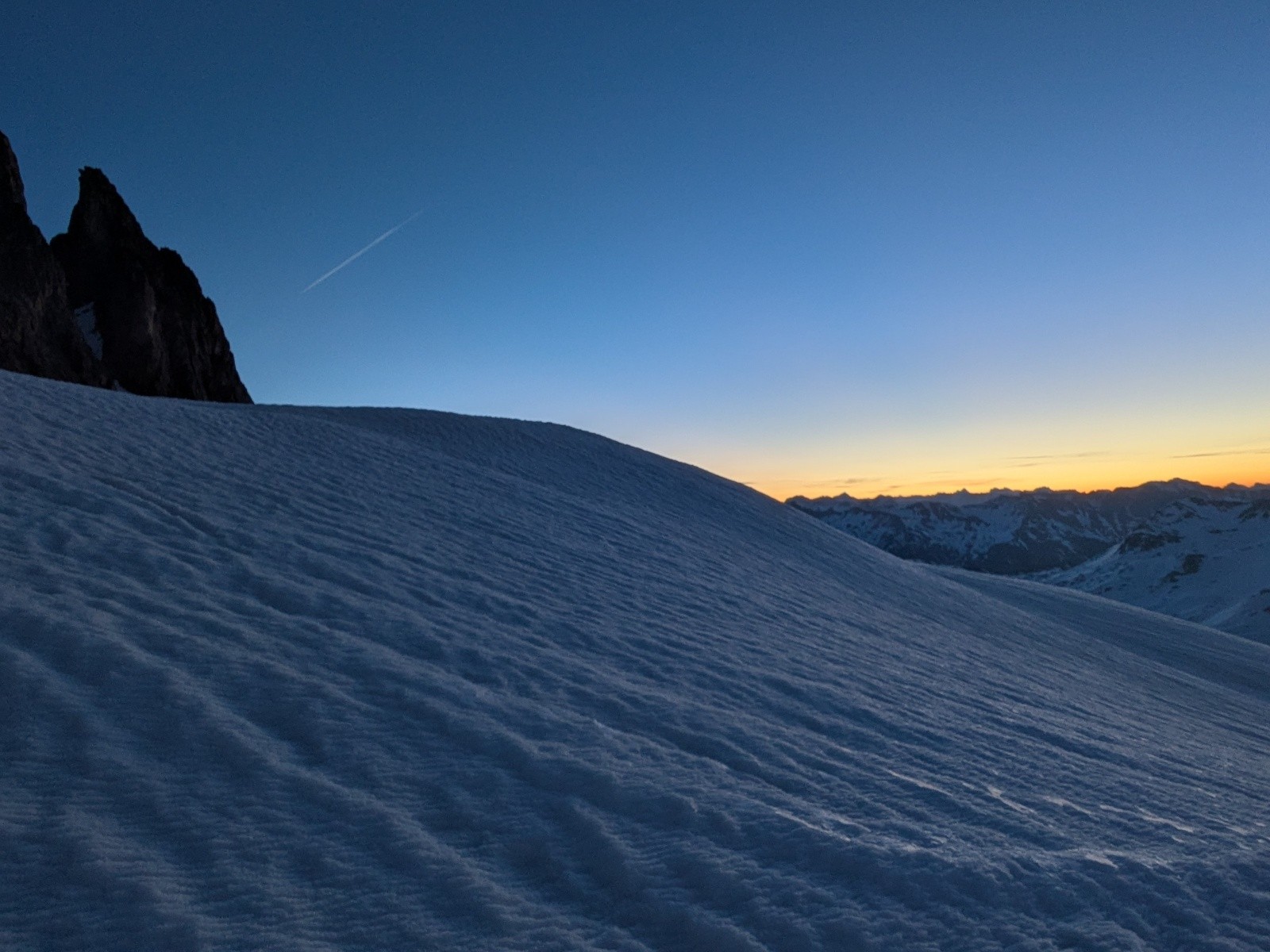 Le replat est long jusqu'au col d'Arsine... Pas trop à droite, pas trop à droite, on louvoie dans le noir. Ah mince on a laissé passer la bonne combe, nous voilà 40m trop à gauche ! Bon on se remet sur le bon axe grâce à Tom. On remonte la morraine, et petit à petit le jour se lève... on découvre le décor qui nous entoure ! J'en suis bouche bée et perd du temps à prendre des photos pendant que Tom, inspiré par Liège Bastogne Liège, en profite pour placer une attaque bien sentie. Pressé d'en découdre et de cramponner, le bougre !