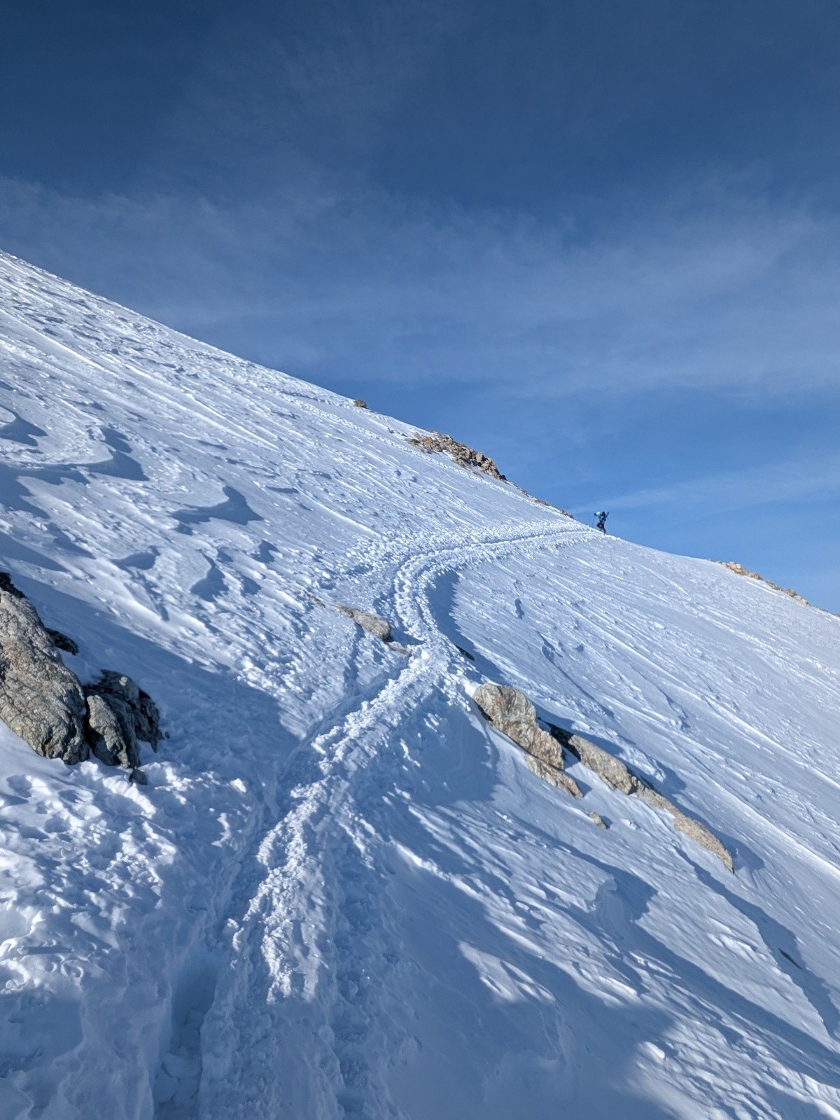 7h30 en haut de la brèche. On est dans notre timing, on reste en crampons pour remonter la crête puis cette belle langue de neige suspendue. La trace est bonne et porte bien.