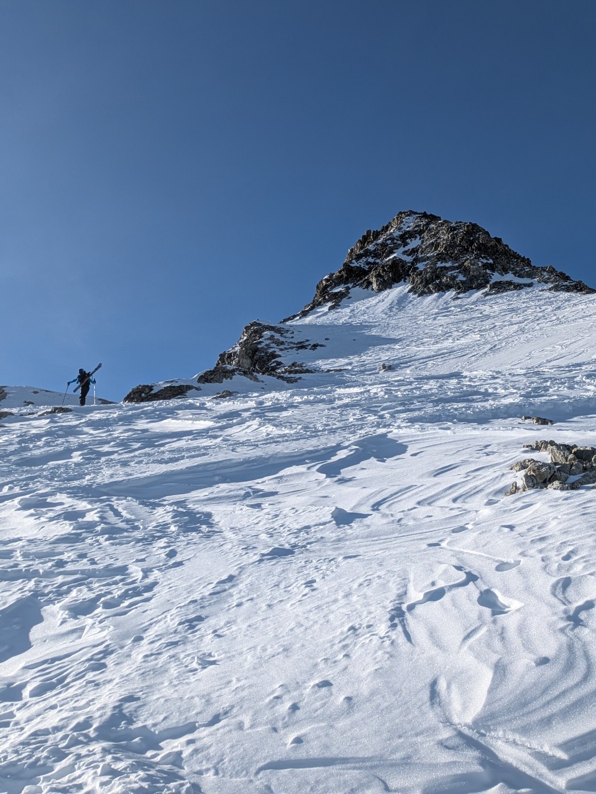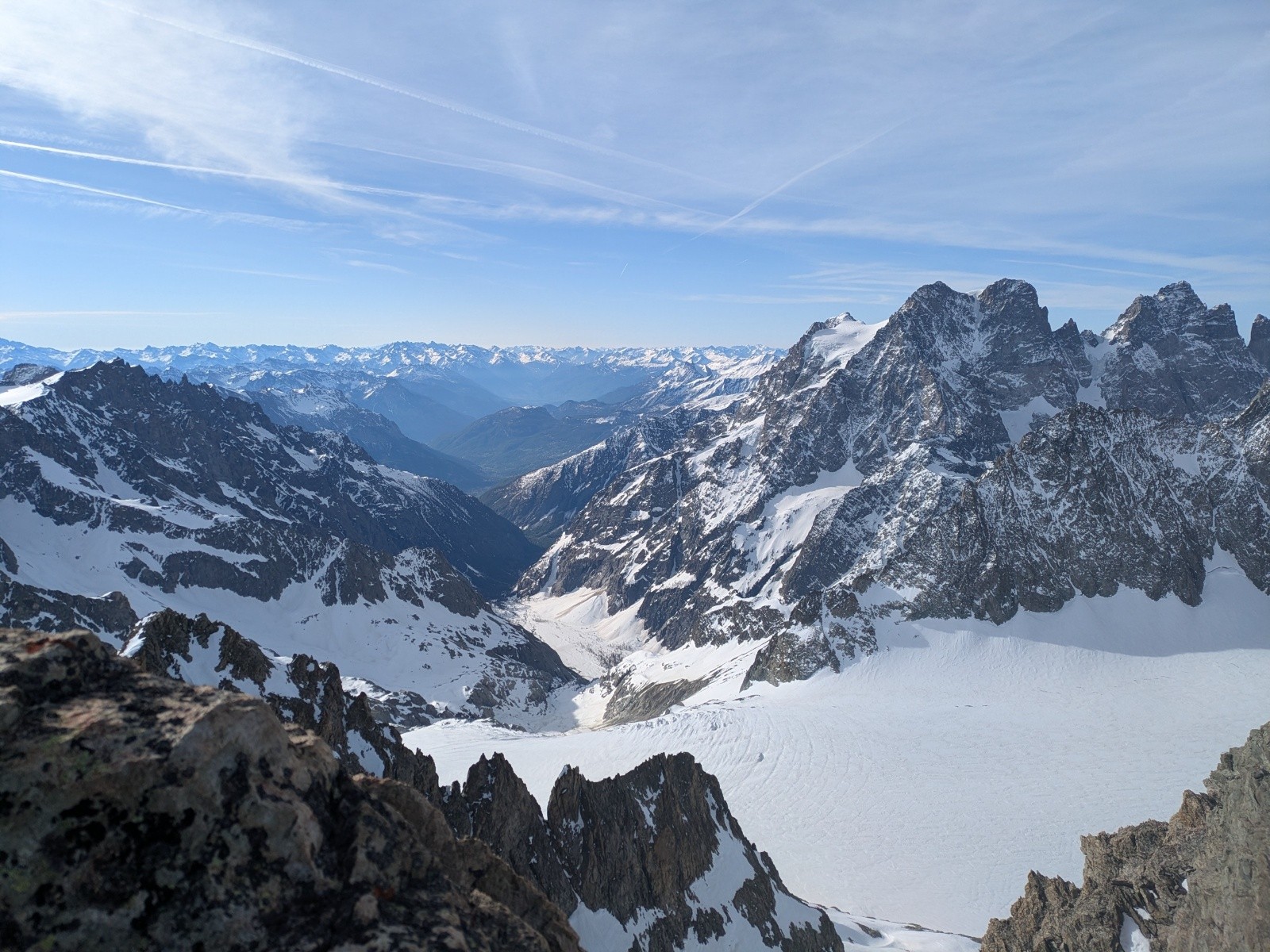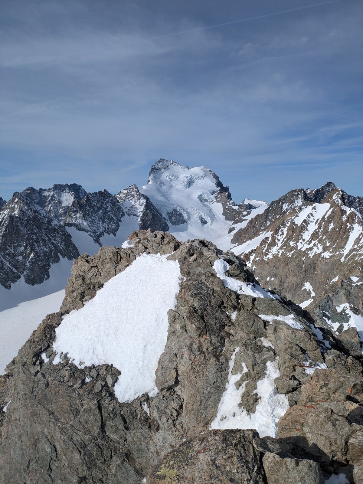 On a bien baissé le rythme sous l'effet de l'altitude et des efforts précédents, on arrive à 3520m, au pied de la pente finale, en rocher. Pour monter, on contourne par la droite sur la facette ouest, et au bout de 30m apparaît un petit couloir qui remonte au sommet. Plutôt en neige dure avec 2-3 passages de qqs mètres en mixte, avec "du bon caillou de l'Oisans" (comprendre : rochers qui se délitent). Contents d'être là avant tout le monde, on redescendra sans craindre de faire tomber une pierre sur une cordée suivante...
