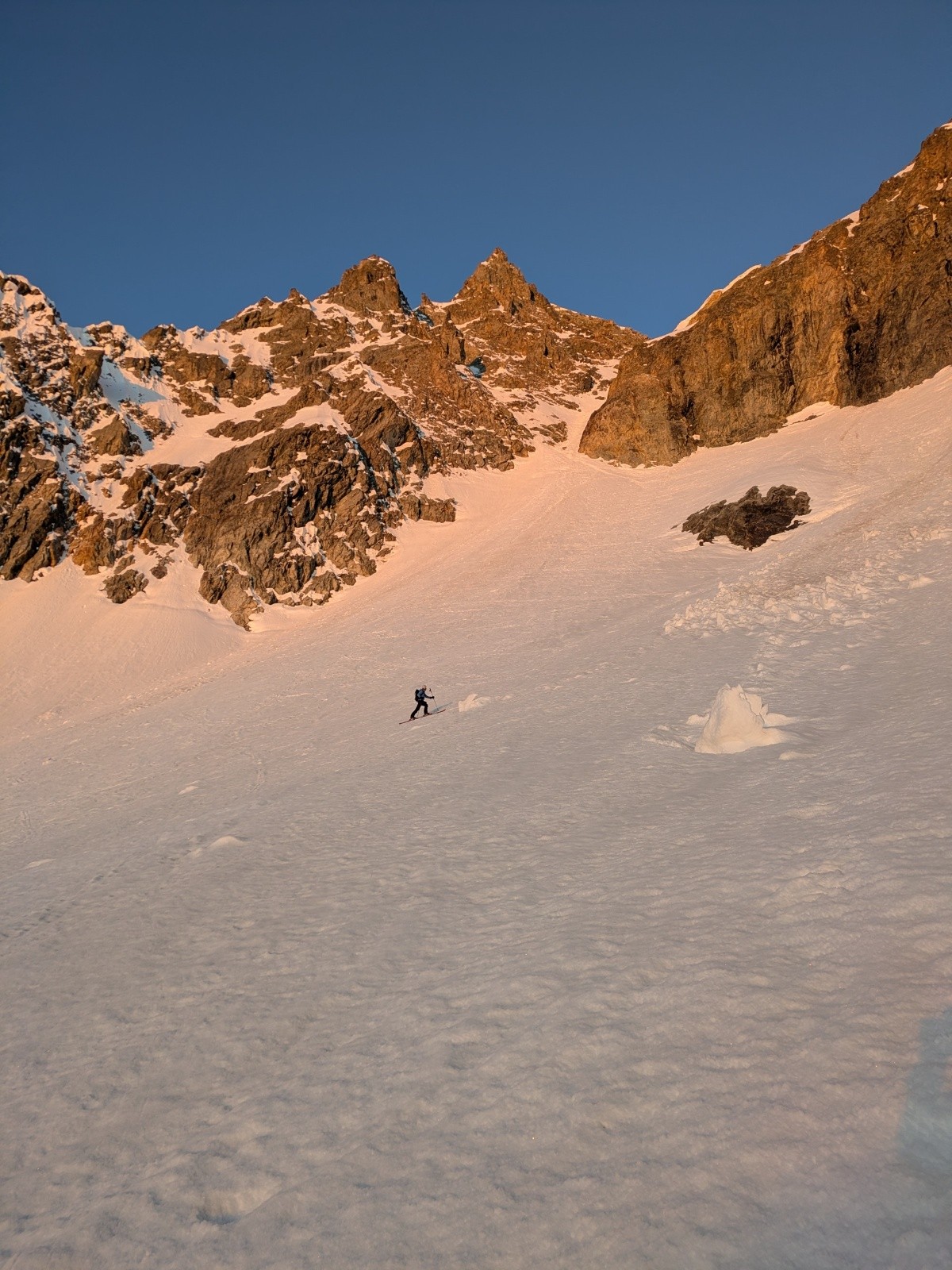 Descente du petit couloir. Retour à 3520m où on avait laissé les skis, on chausse et c'est parti !