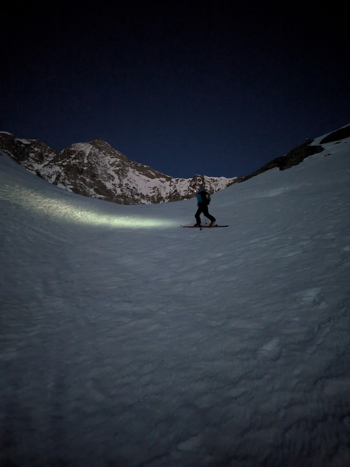 Vers 6h30 on est au pied du couloir, on met les couteaux et 200m plus loin on cramponne. Bonnes marches dans le couloir, neige dure qui porte, c'est assez confort en fait...