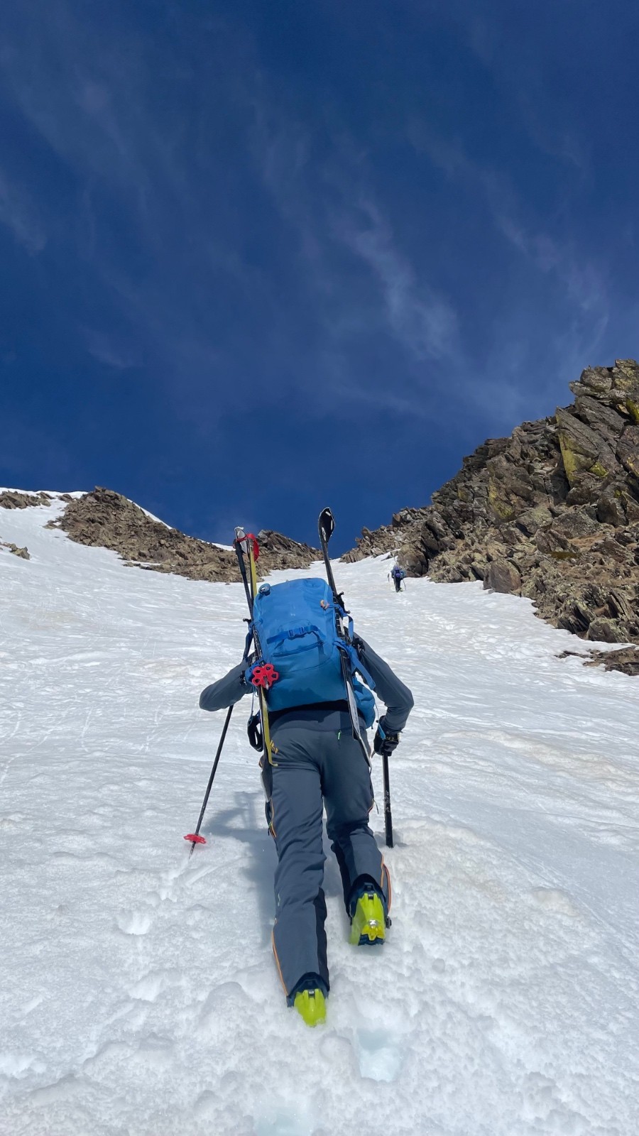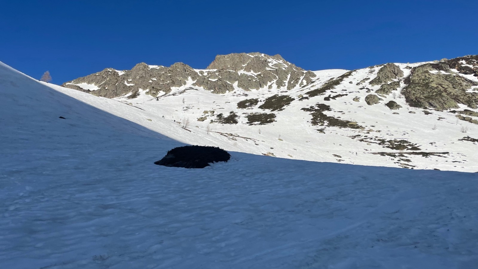 Itinéraire suivi : Départ du pont sur le torrent à San Bernolfo. Nous avons décidé de monter sur la rive droite du torrent entre les arbres. On passe encore même si le trajet est parsemé de branches d'arbres. Il est plus aisé de monter en voiture sur la rive gauche du torrent et gagner ainsi 150m (c'est la solution choisie par la majorité des skieurs hier mais pas par nous...). Vers 2000m environ on laisse à gauche le Val di Seccia et on monte droit dans de belles pentes puis on rejoint la conque sous la Roche Nègre et les Becs du Corborant. Deux couloirs parcourent la face est du point côté 2840m. Nous avons choisi le couloir de gauche pour monter en crampons. Au sommet du couloir, magnifique vue sur la Tinée, pile en face d'Auron. On monte à droite jusqu'au sommet en laissant les skis au départ du deuxième couloir qu'on empruntera pour la descente, situé plus au nord du premier sur la crête. Très belle pente bien ludique (maxi 40-45° sur un bref passage au départ - 3/4m de large- on peut tourner...).
