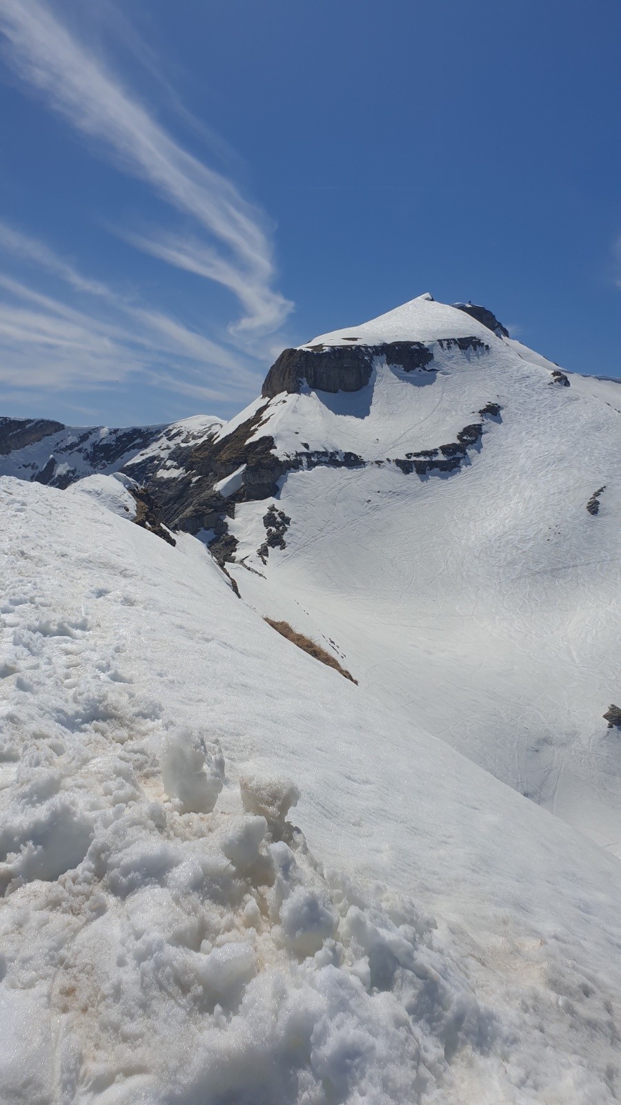 La descente (vers 13h30) le passage délicat de la montée est gelé prudence et le retour à l arete également ensuite très bonne neige
