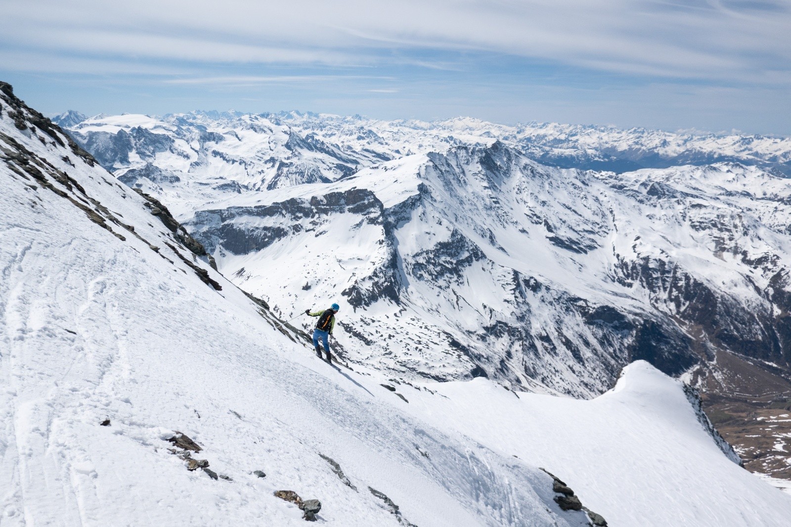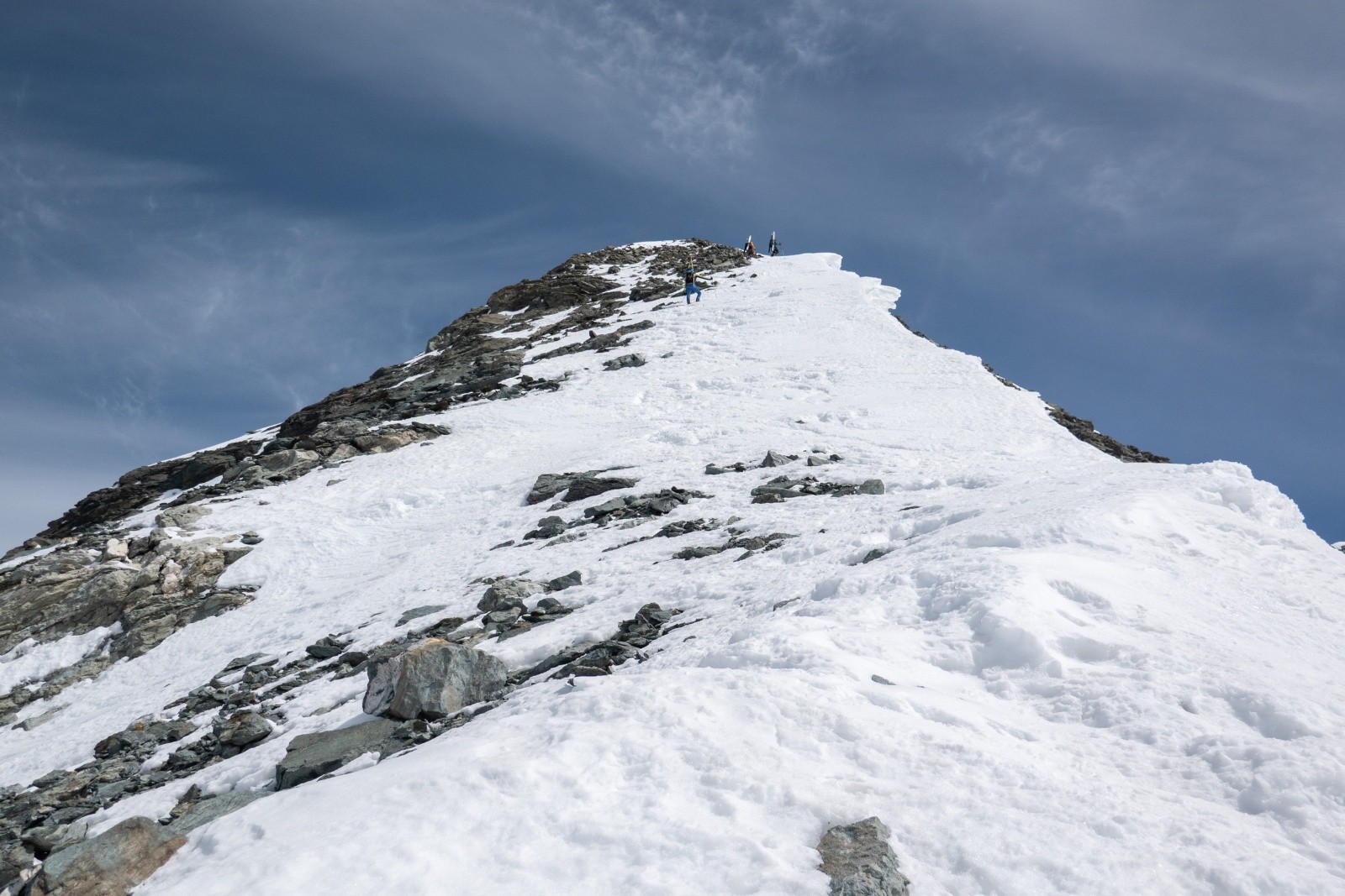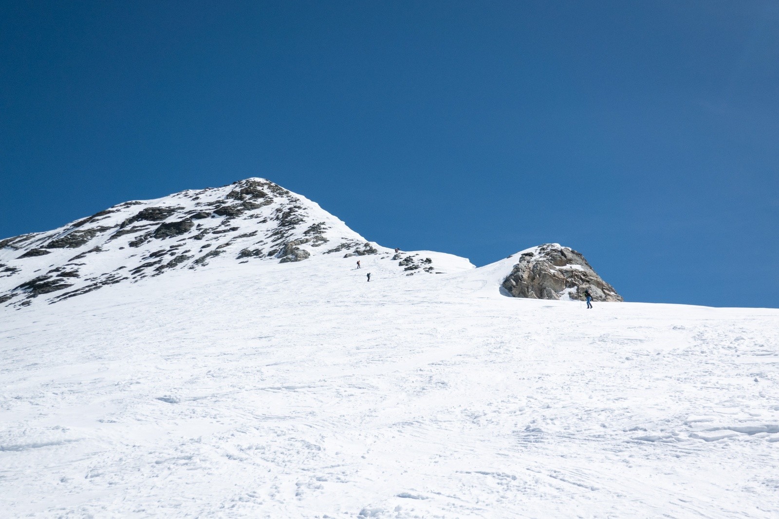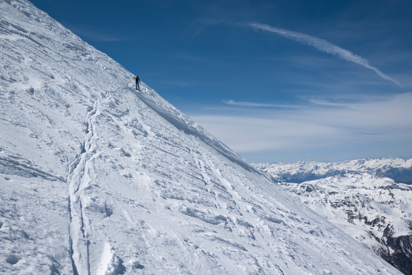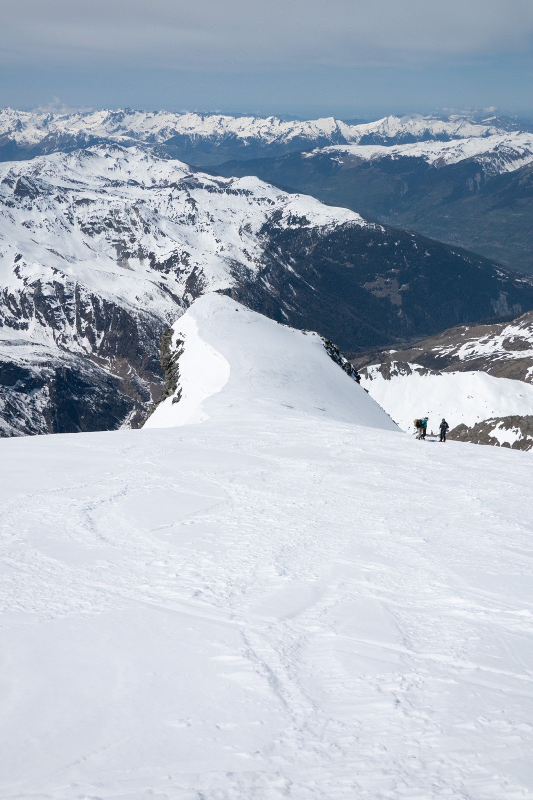 Arrivés 100m sous le sommet, une question se pose : on laisse les skis ici ou on les monte ? La corniche pour accéder au sommet est en neige glacée, elle ne fait pas envie. On a vu des couloirs à gauche qui semble passer, on se dit qu'ils aurons moins pris le vent : on emmène les skis là haut !