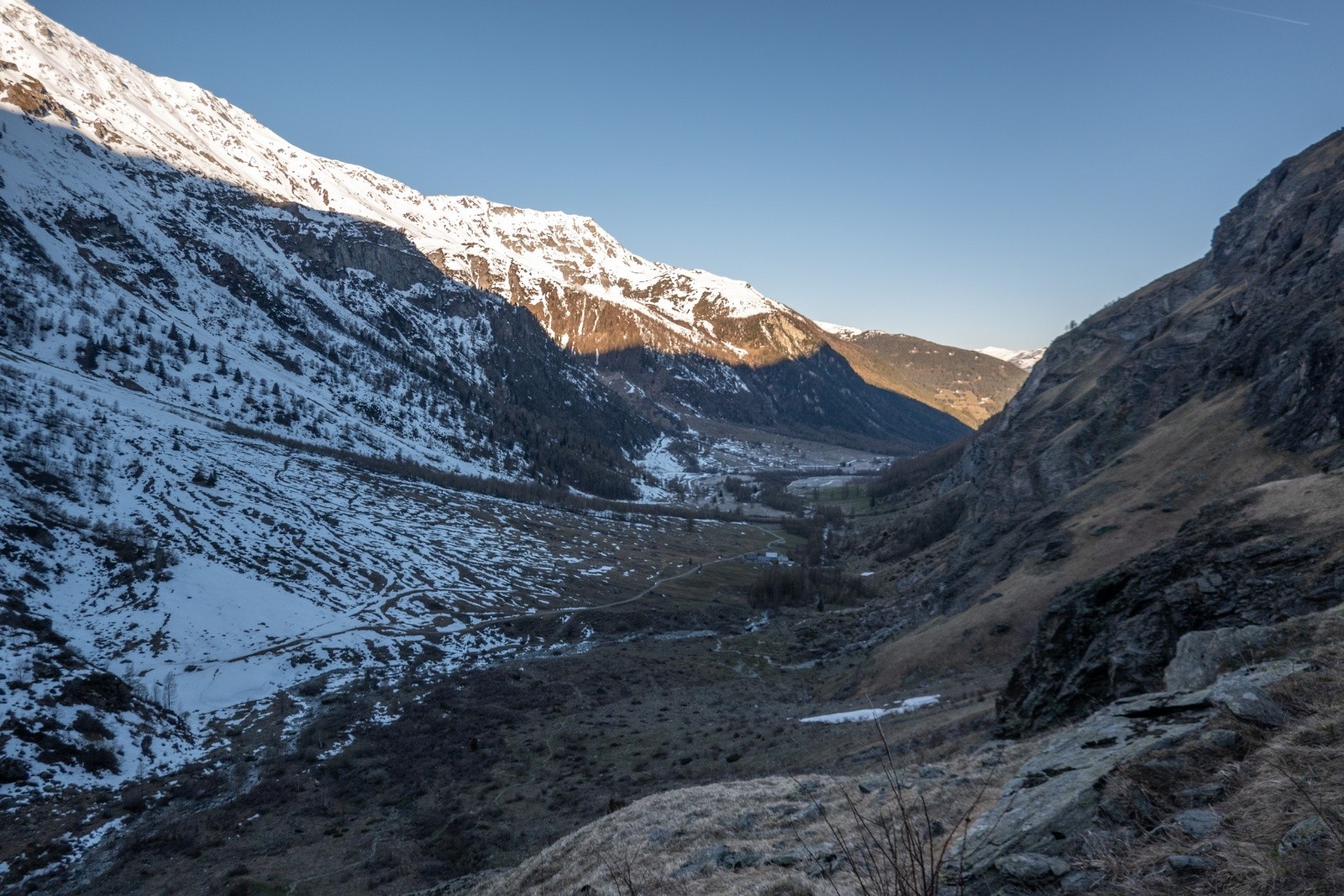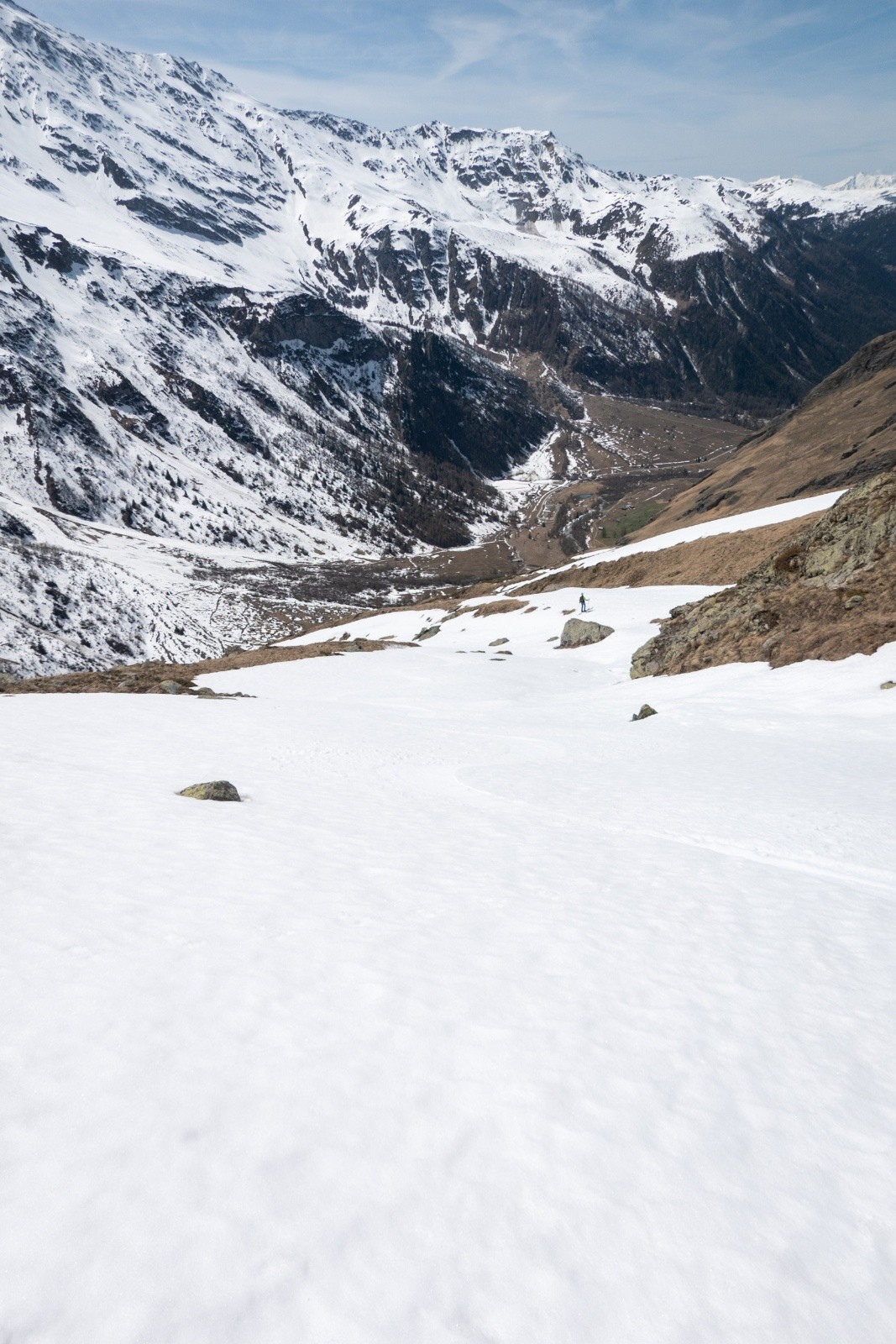 Petite traversée sommitale en cramons pour la descente puis on arrive dans le couloir. La neige est glacée, la pente est assez raide. Du plaisir ? Aucun ! Après un virage sauté au dessus de rochers, on prend un piolet pour descendre en dérapages sur une neige immonde. C'est long, peu plaisant mais ça passe. Quelques cailloux à passer et on sort enfin de ce bourbier (le premier… )