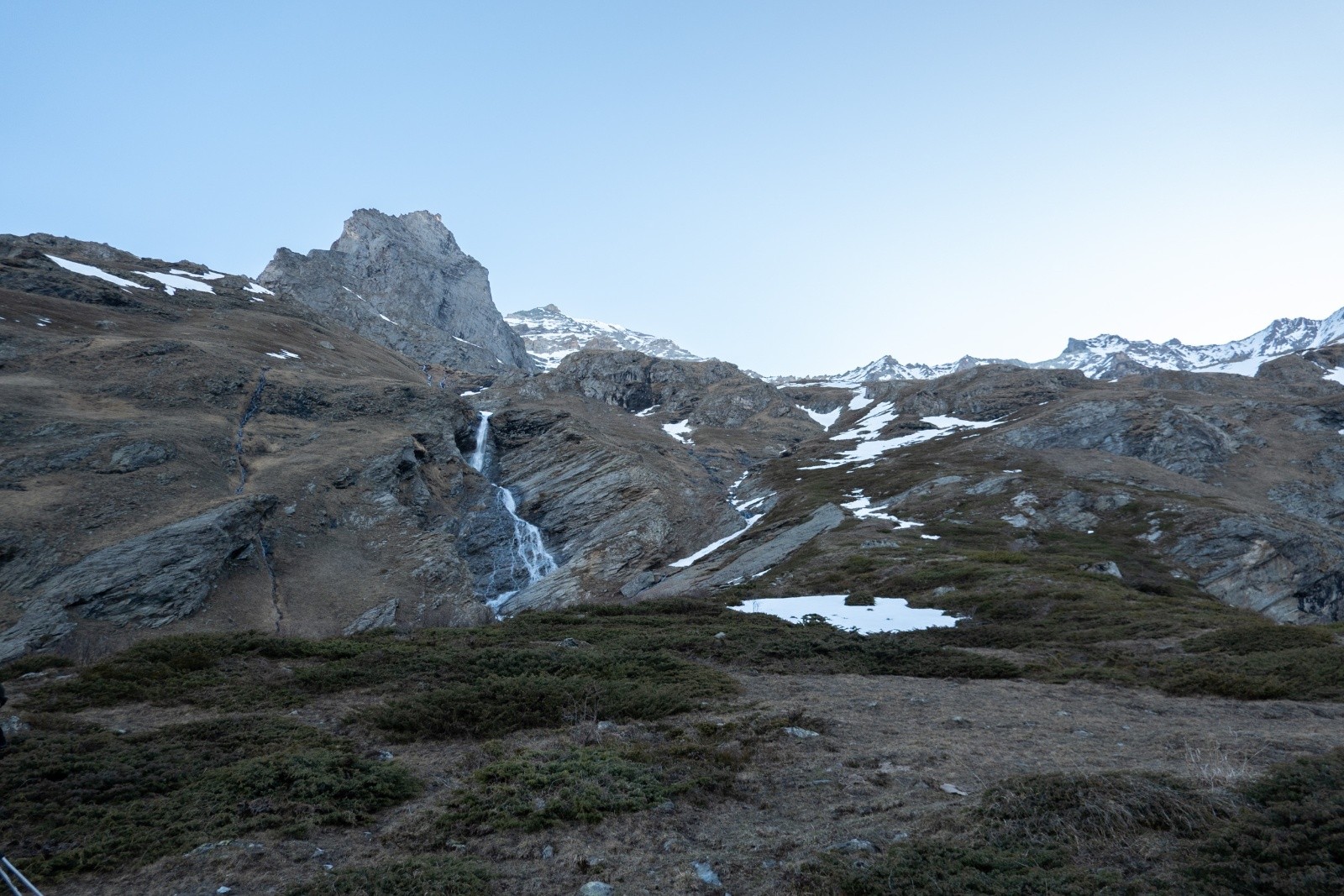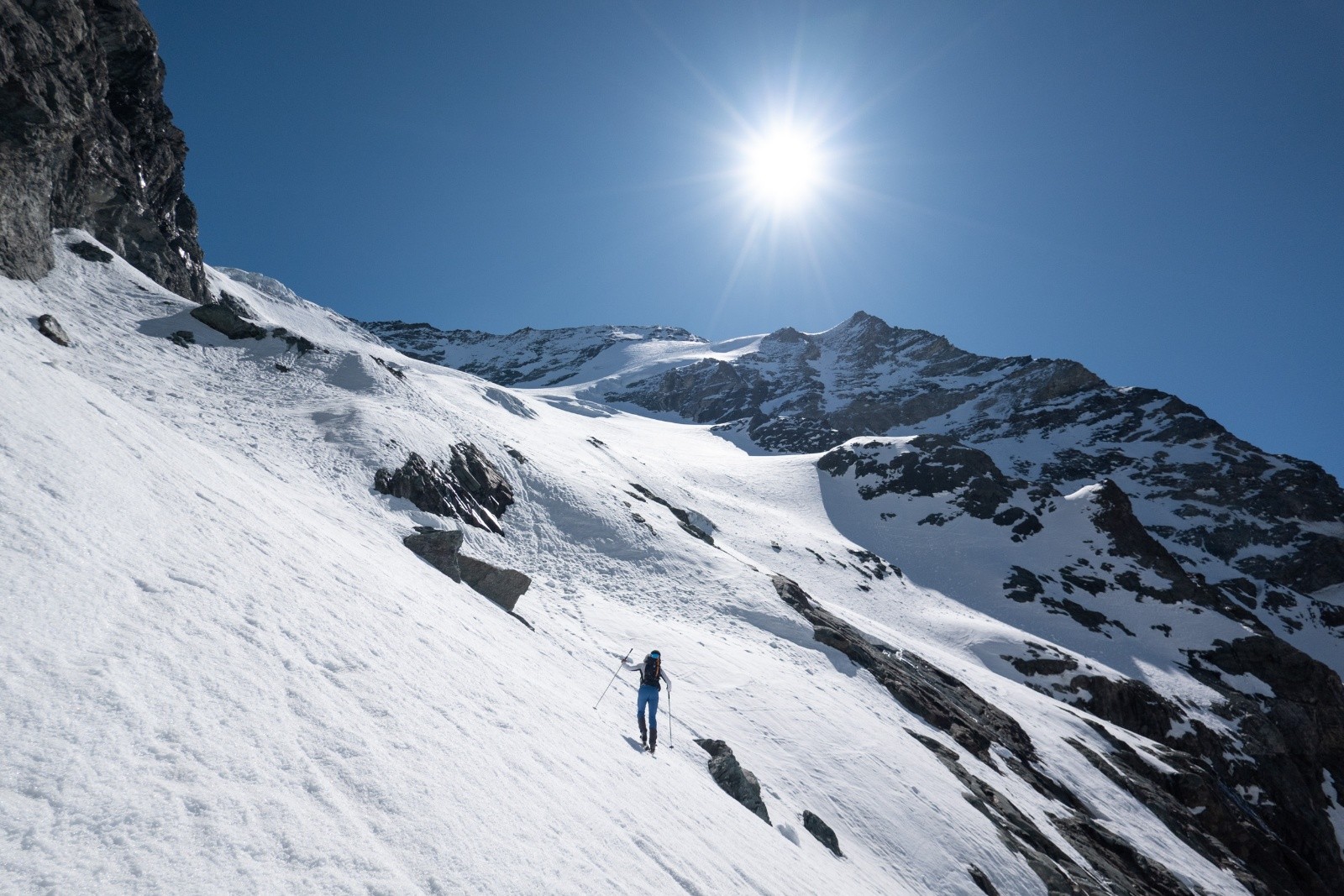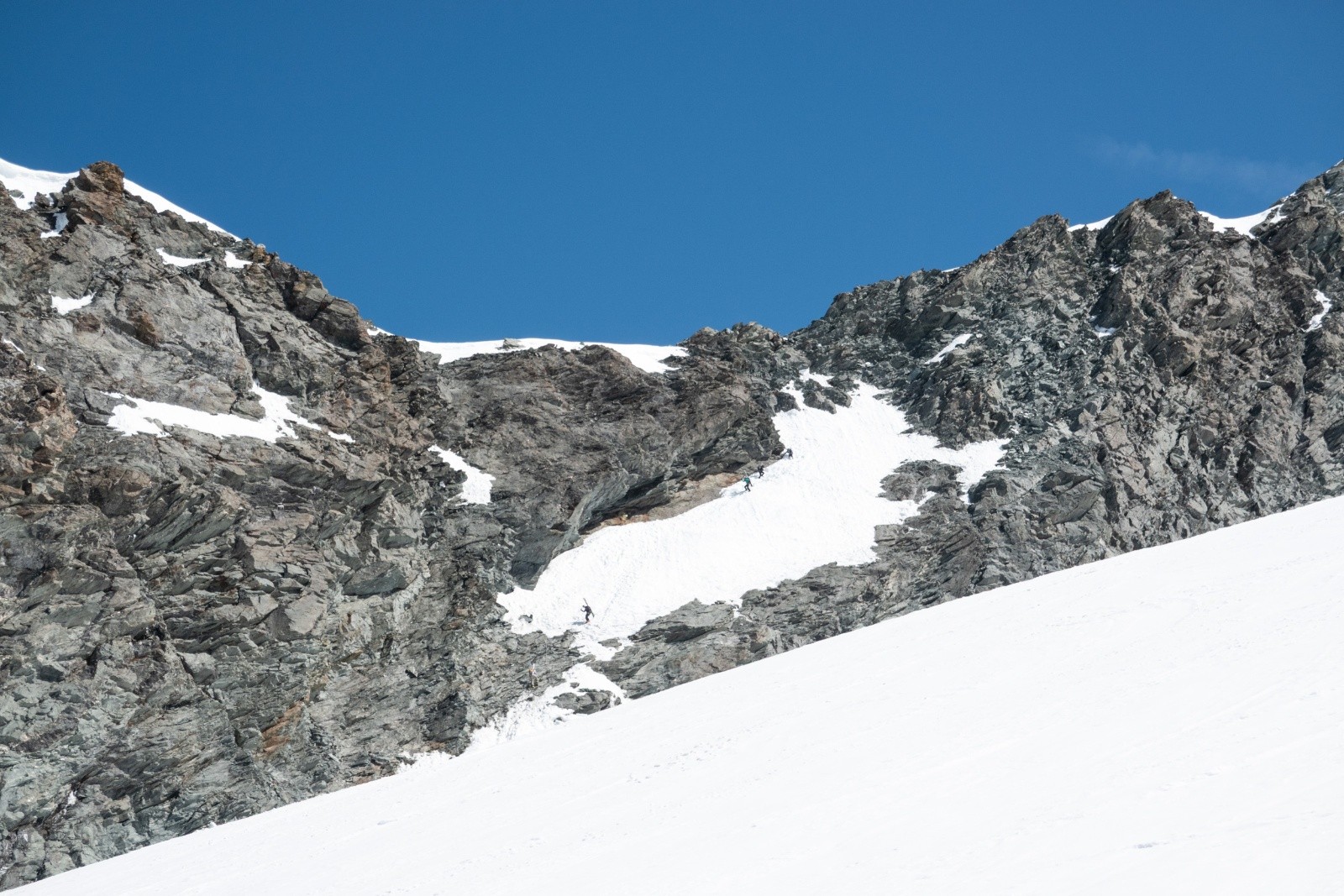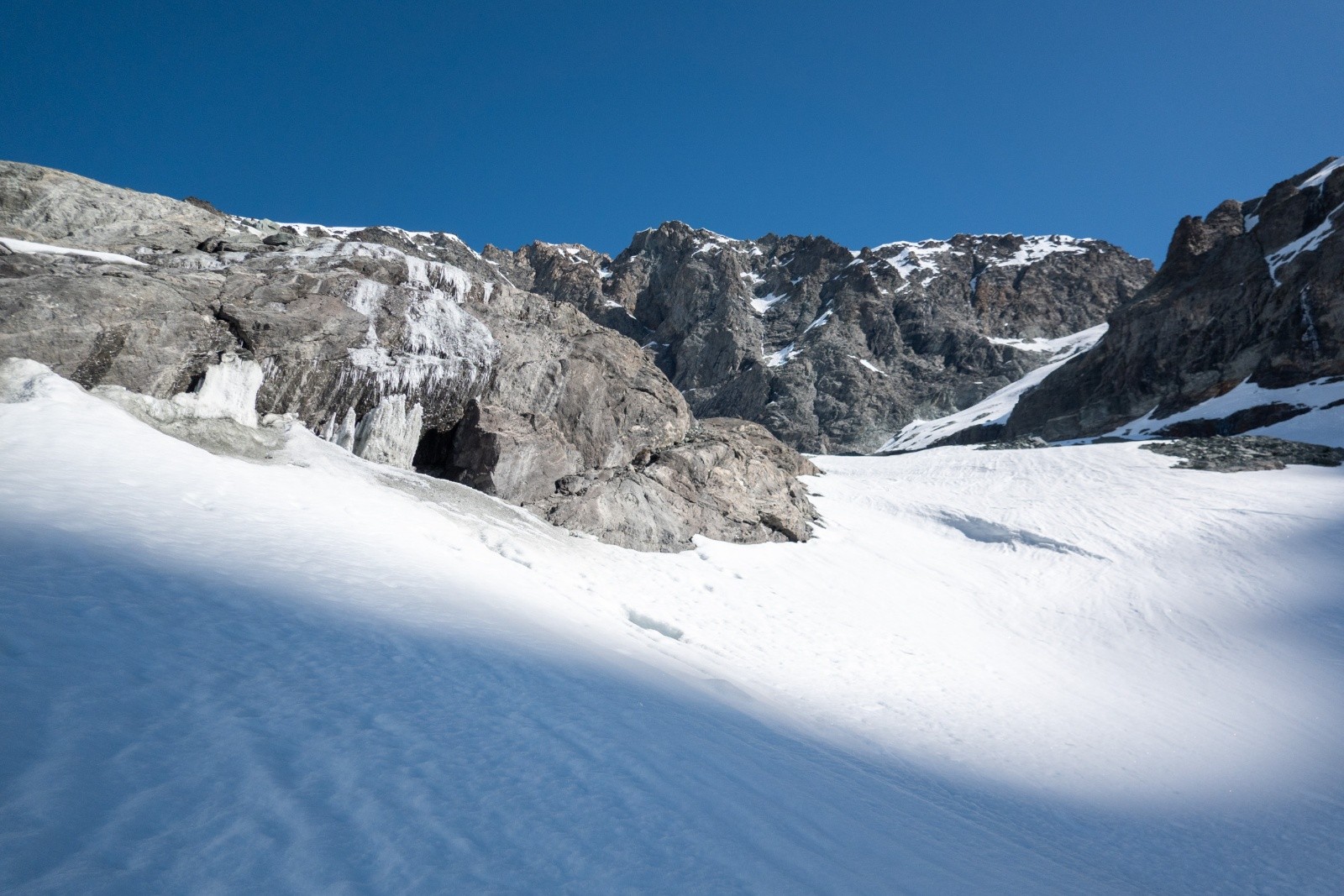 Dans la rampe du glacier, petit passage relou au dessus d'une rimaye, sinon la trace est évidente.