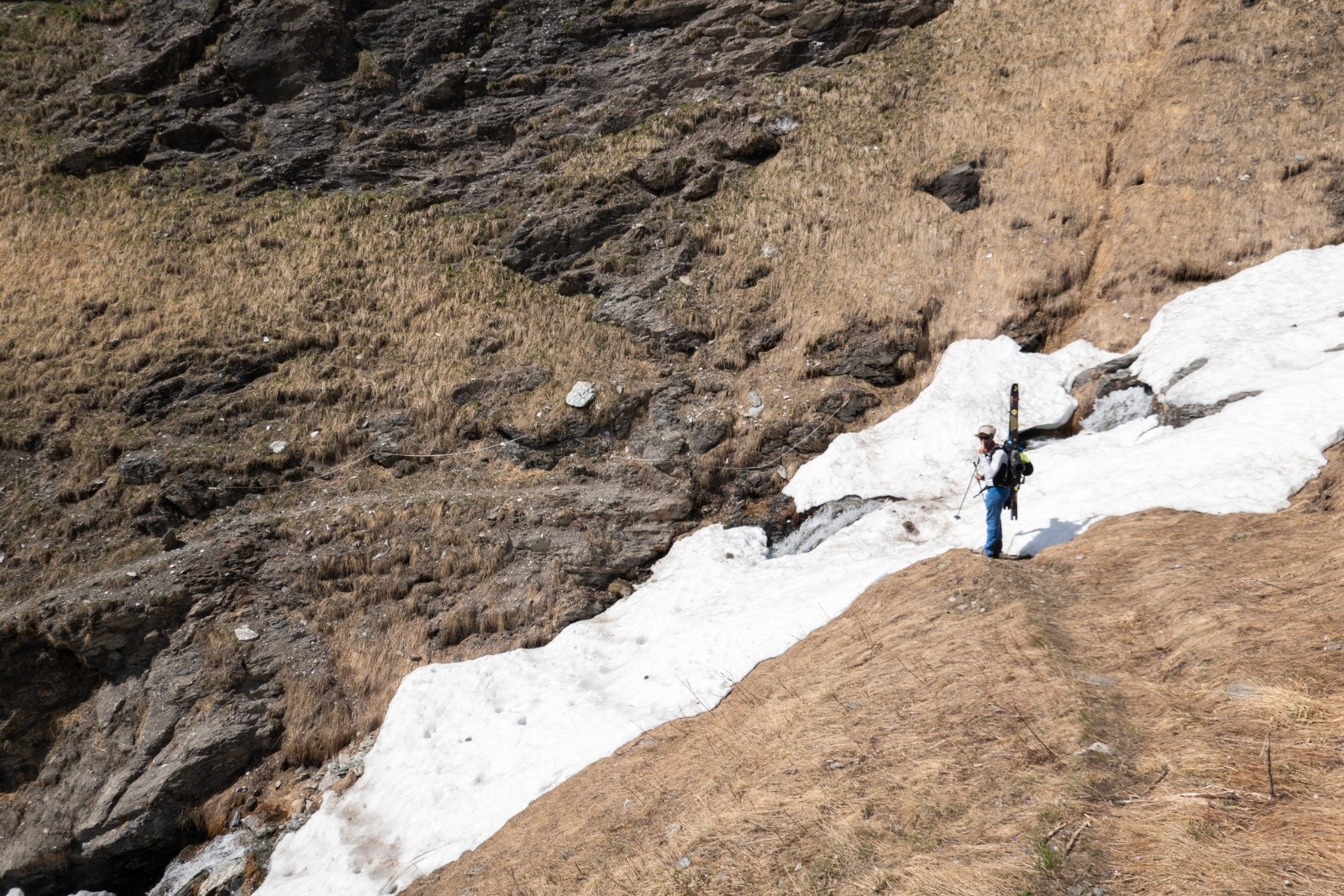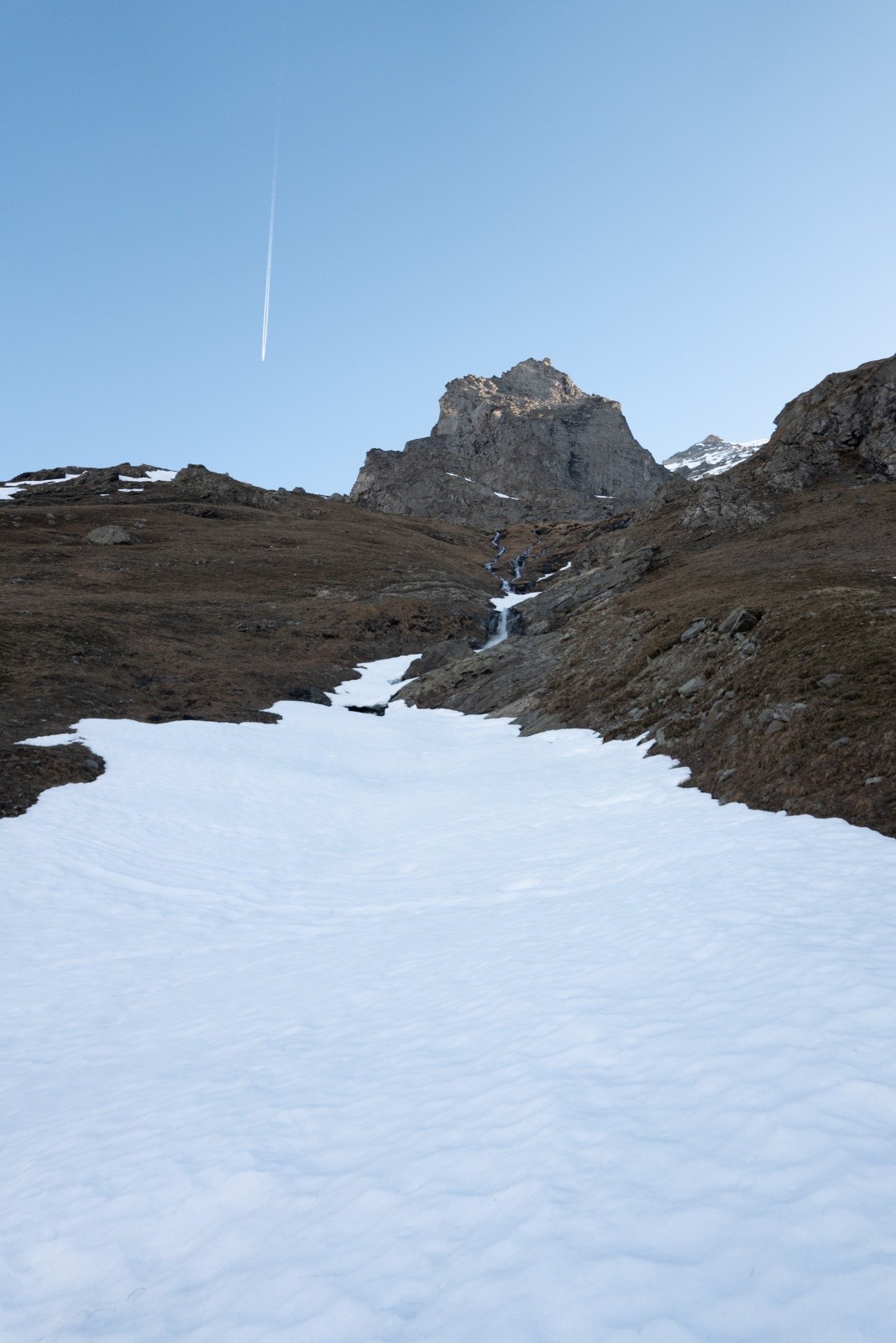 Pour la montée, on pensait d'abord prendre le tracé IGN de ski de rando qui passe par le GR5. Mais au vu du la tête du chemin, on a préféré prendre le chemin dans la face Sud, tout sec. C'était parfait. Au niveau du ruisseau du prêtre, on voit que le chemin part dans les névés : direction les pentes herbeuses pour les esquiver.