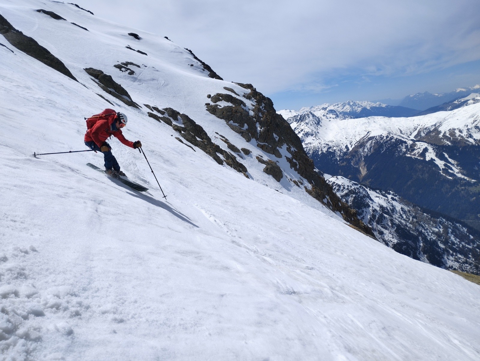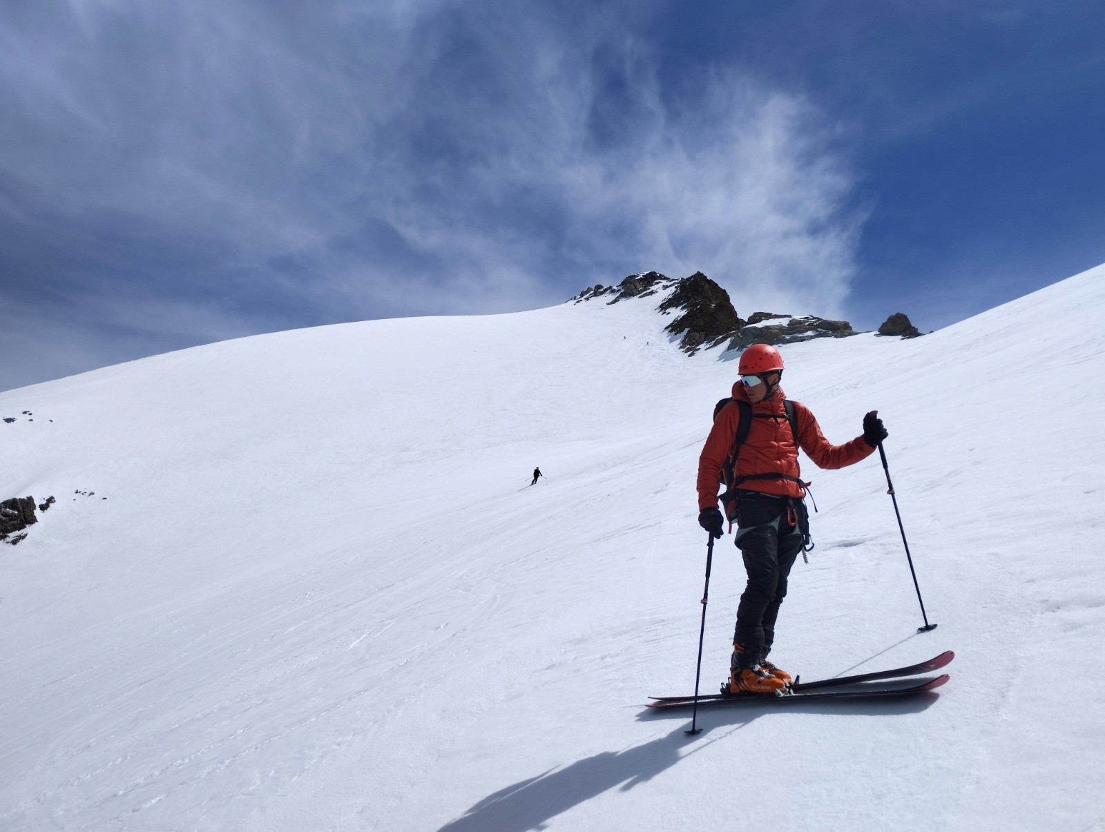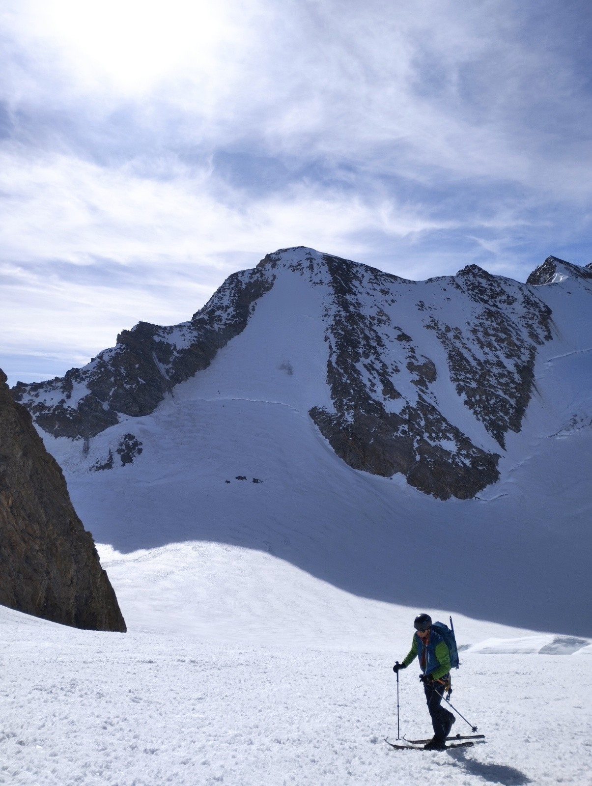 Pour la descente on sort au plus tôt du glacier en tirant à droite, à noter deux passages en dry ski sur les cailloux, ou en dechaussant (bien galère de rechausser après dans le devers)
