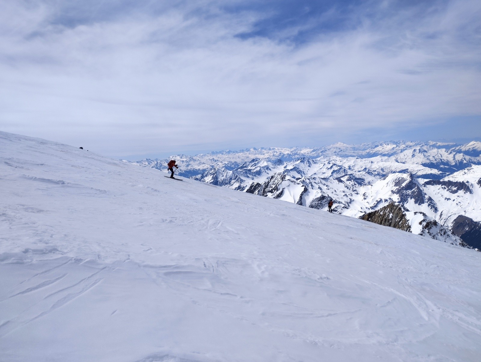 En haut du glacier, neige dure mais plutôt lisse avec bonne accroche.