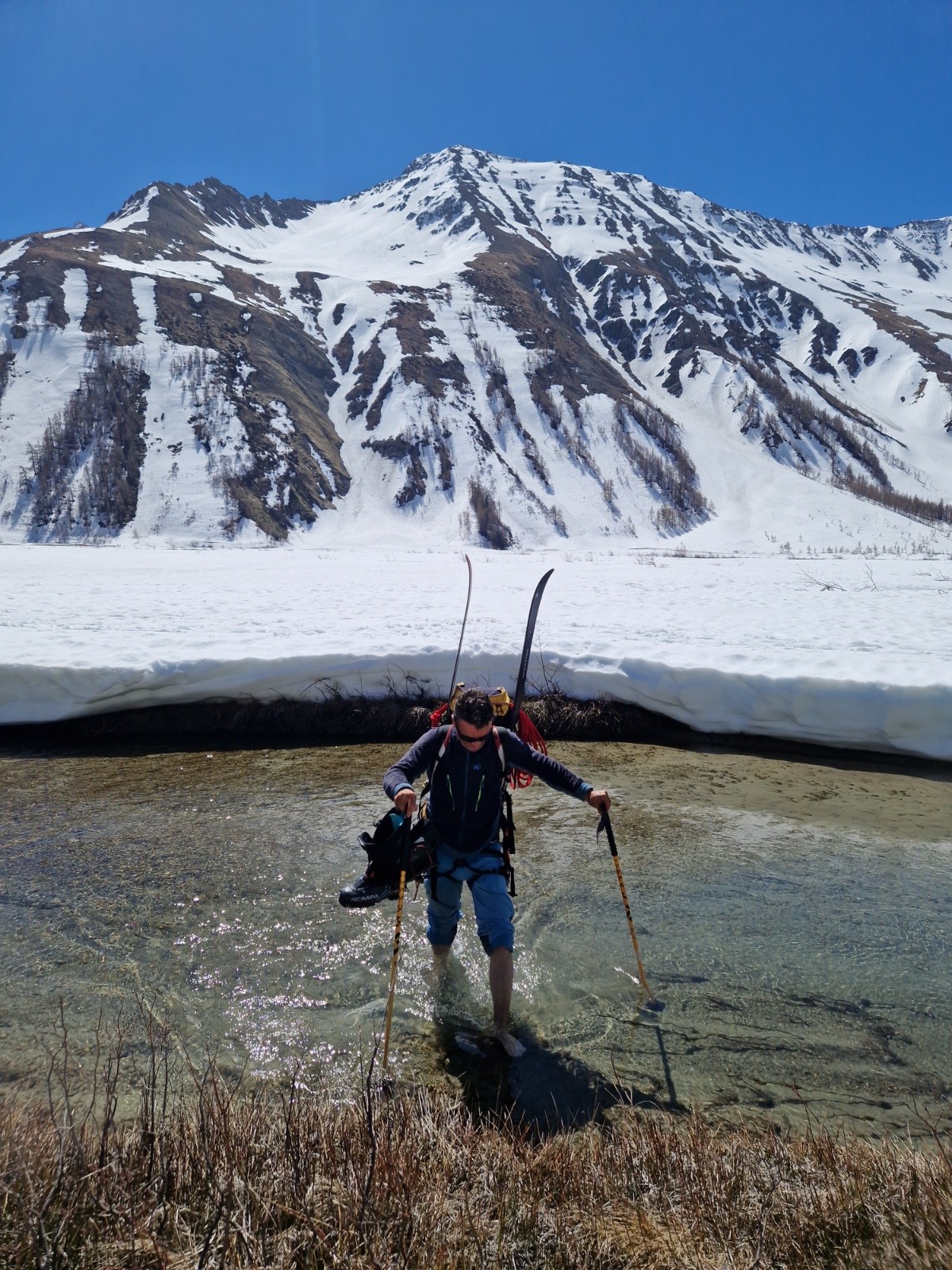 Arnaud traverse pied nus. On fait sécher au soleil et au vent avant de monter sur le glacier du Miage.