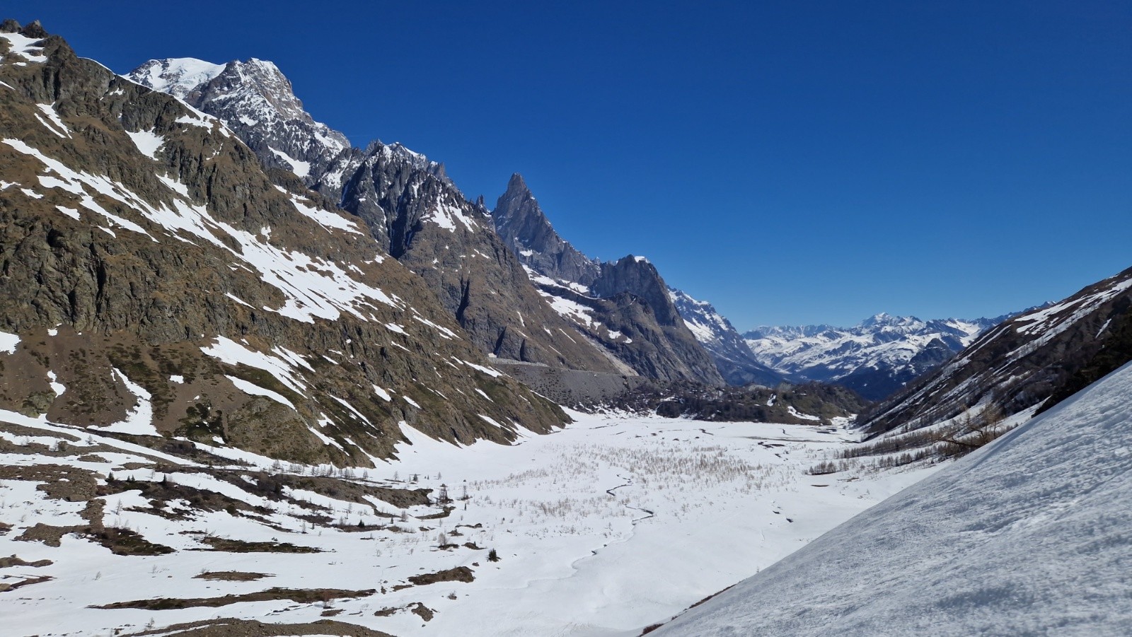 Le lieu est particulièrement sauvage. Le cadre est grandiose. On passe sous le glacier du Mont Blanc. On aperçoit le sommet tout là-haut… On se sent minuscules.