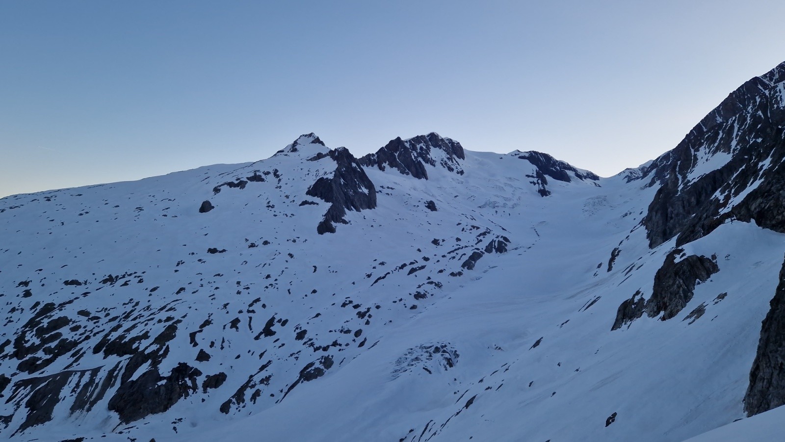 Montée au col des Glaciers au petit jour. Neige dure : couteaux puis crampons.