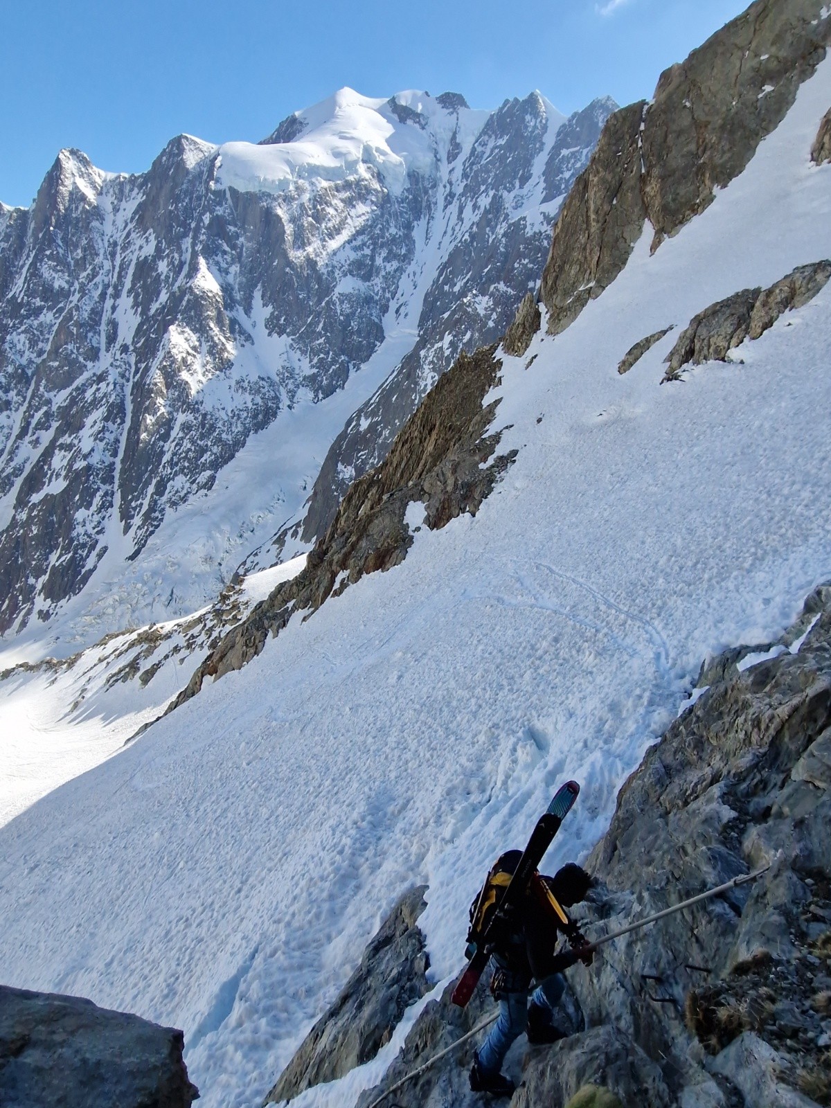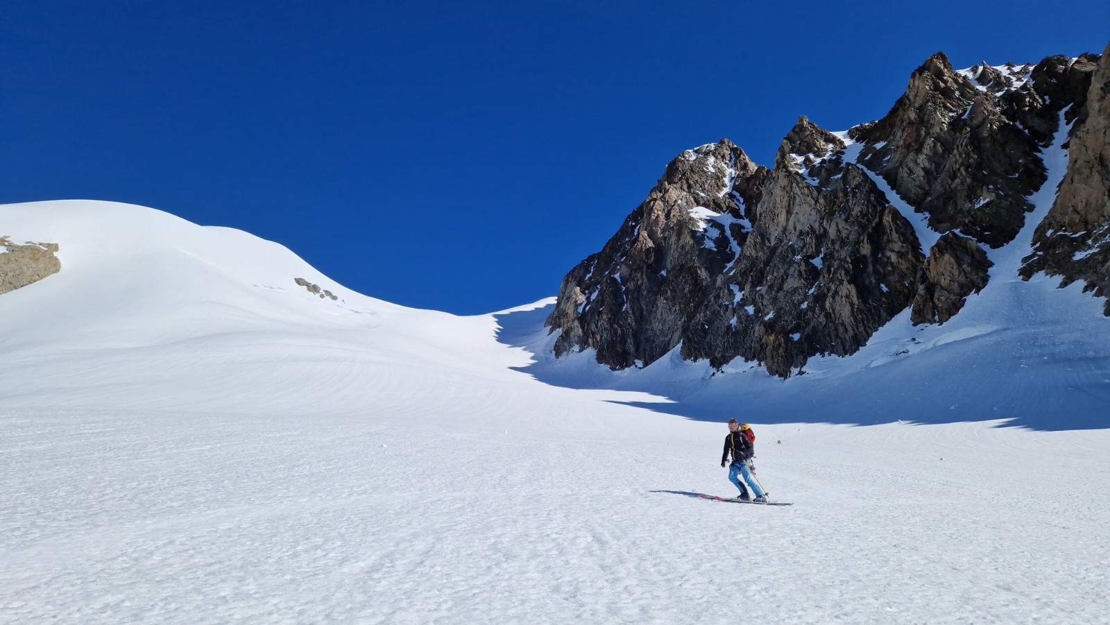 Nous empruntons une petite combe qui nous amène au sommet de la moraine. De là nous descendons à pied sur le glacier par une pente enneigée, nettement plus sûre que les éboulis.