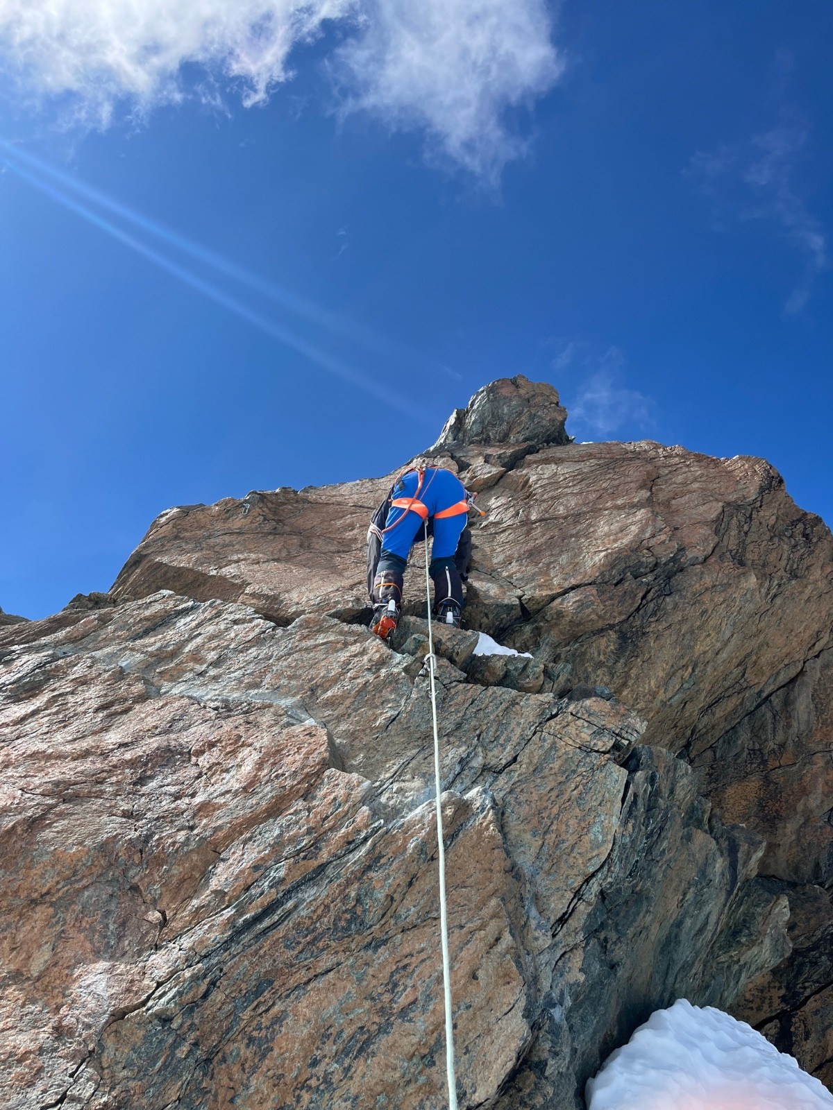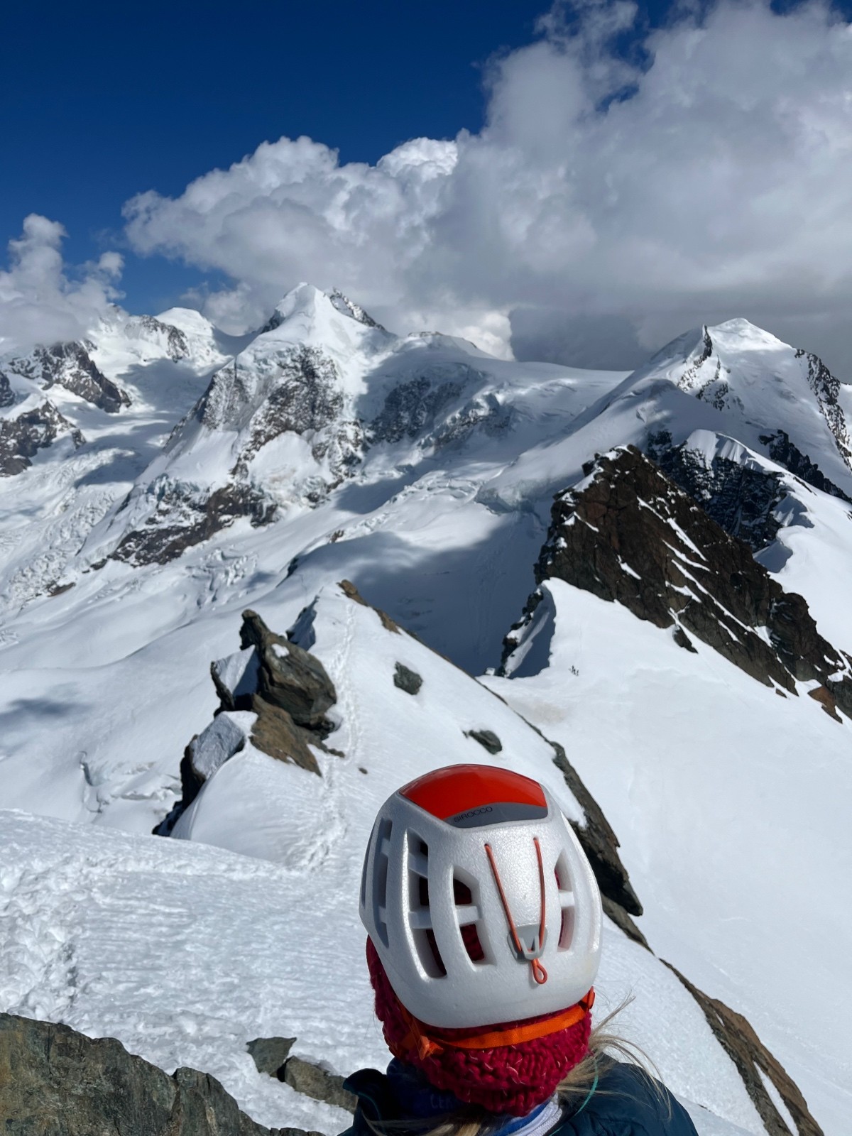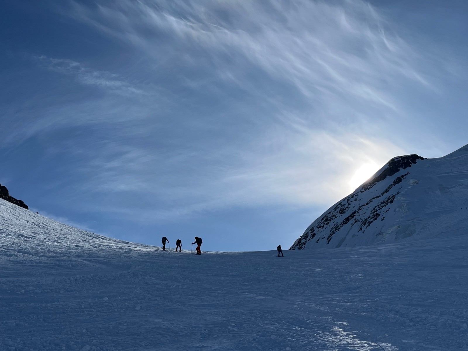 Itinéraire suivi : sur 2 jours. Plateau rosa, breithorn w, traversée breithorn central, ski à l’aplomb de l’oriental, ascension en mixte de l’oriental. Descente au refuge des ayas. Le lendemain, castor, pollux et retour