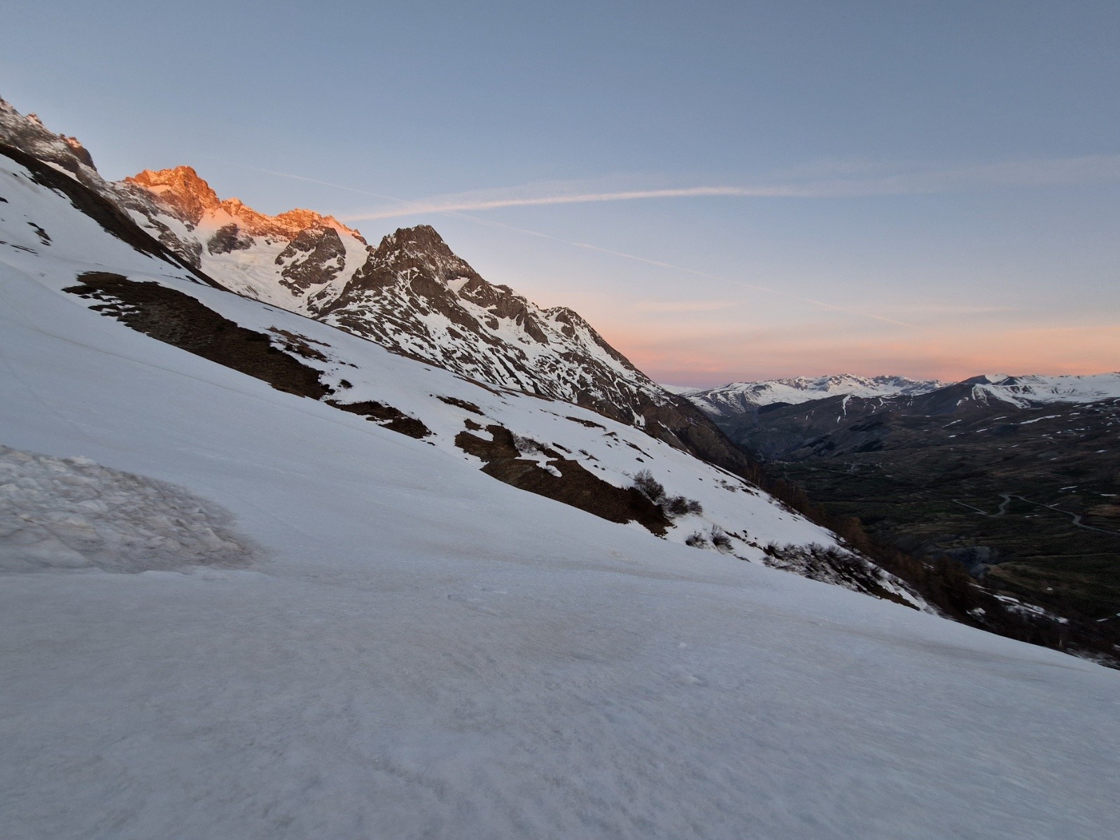 Le magnifique lever de soleil sur la Meije me fait vite oublier mon réveil matinal et le cheminement parfois pénible entre le pas de l’âne et le bas du couloir.