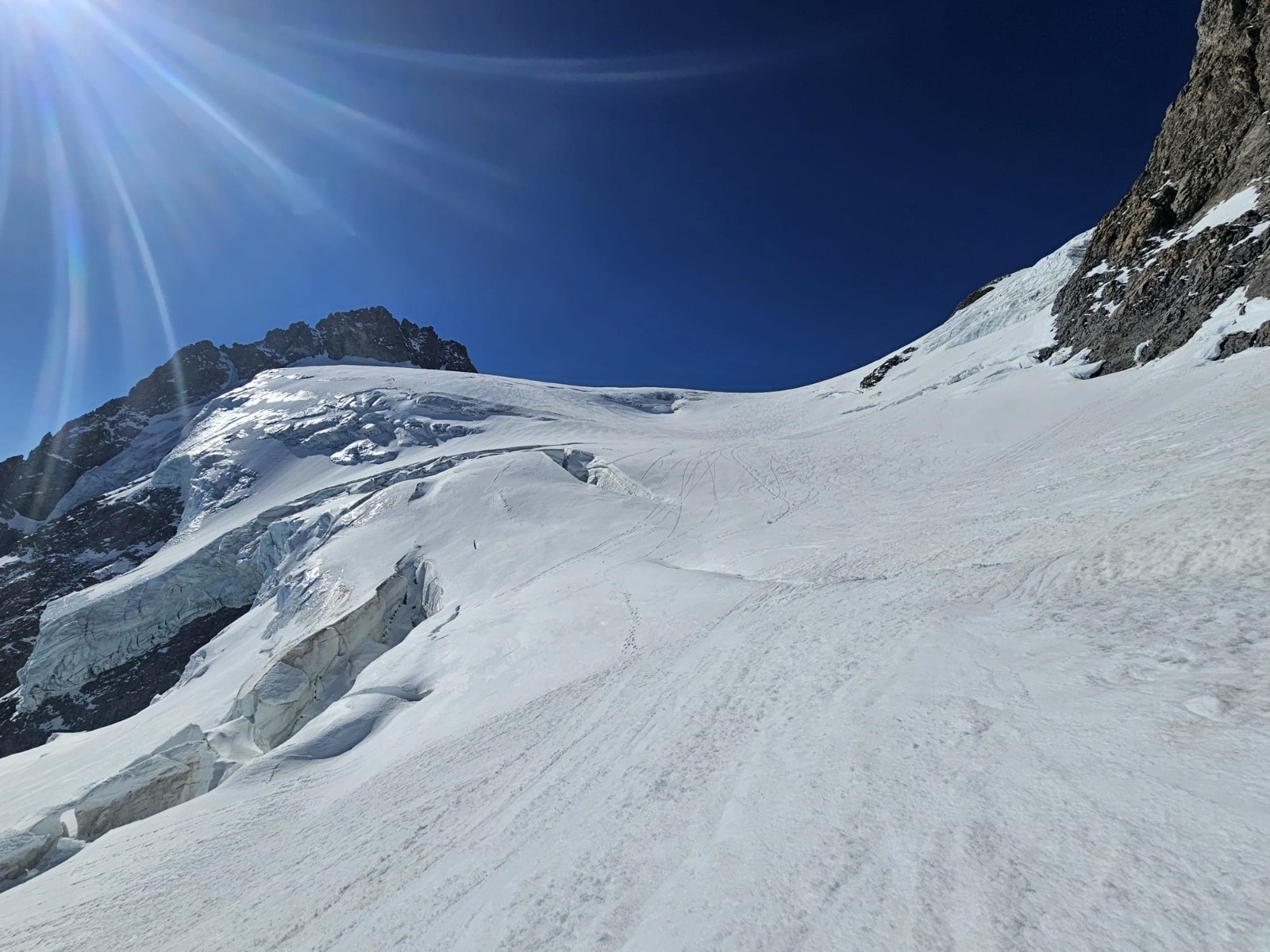 Conditions pour le ski : Moquette courte sur le haut puis a partir de 3300m, quelques passages en neige dur voir en glace après le premiers rappel notamment en RD des violettes, puis moquette de plus en plus longue (quelques courts déchaussages sur les 150 derniers mètres de dénivelé avant la traversée vers le ravin des militaires qui est sèche, le ravin des militaires en moquette courte ou longue selon expo.
