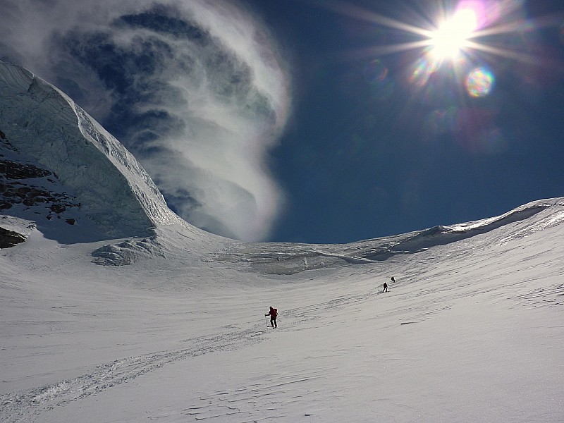Poudreuse de Chabod au Col de Montcorvé, passage en glace 50m au dessus du col, puis très dense et soufflée.