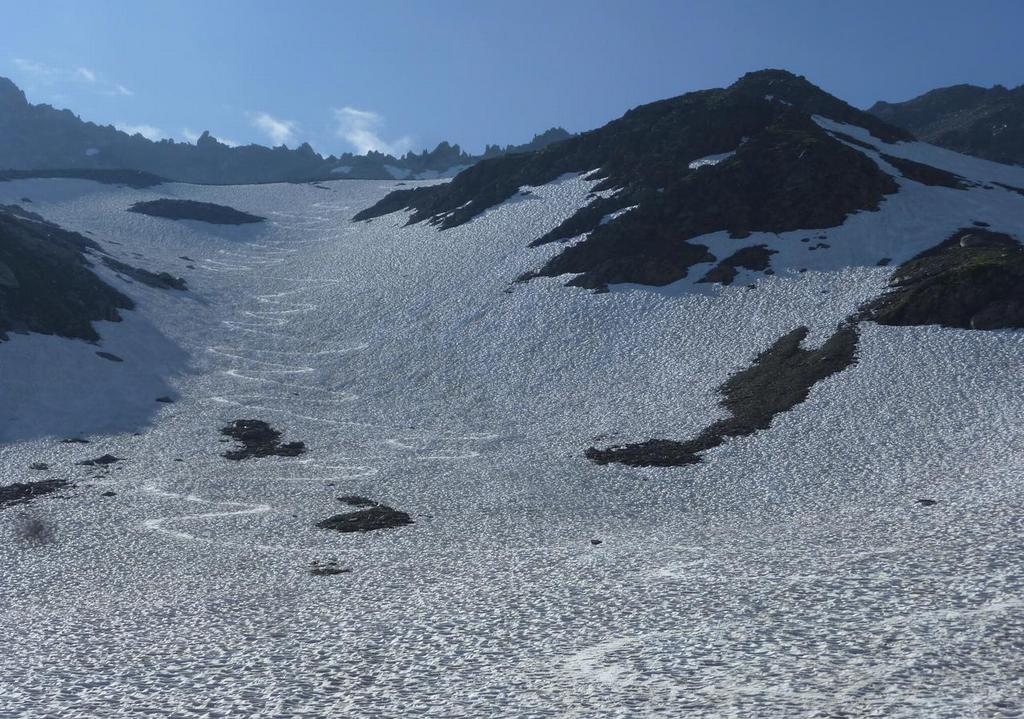 Comme je veux faire une dernière descente sur les lacs, je suis parti tôt. Le jour a commencé à prendre de mauvaises habitudes. Il se lève plus tard. L'effet des vacances peut être ? Les nuages qui cachaient la lune se bousculent vers le nord pour mon plus grand plaisir et laisse le champ à un ciel clair, tout au moins au lever du jour. Une nuit couverte, un isotherme 0° à 4500m, pas de vent, je laisse les crampons à la voiture. Et surprise, la neige dont le relief s'est beaucoup accentué ses derniers jours, est plus dure que prévue. Je ne m'explique pas cette curiosité. Chaussage à 2000m, suivi de 2 déchaussages. Il y a encore plus de 1m de neige dans les zones plus à l'ombre. Merveille que cette course au Nord !! Il fait bon, bien que 10° de moins m'auraient parfaitement convenu.
