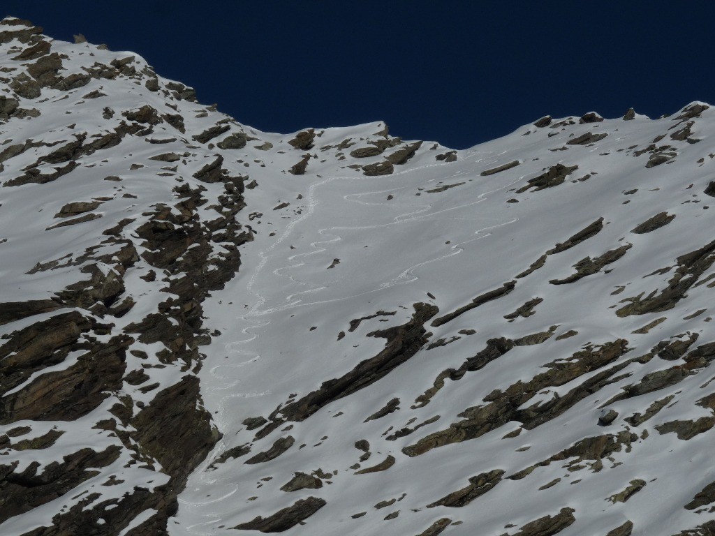 La deuxième descente est la bonne, seul léger problème en bas du couloir où le manque de neige m'oblige à déchausser et descendre quelques mètres sur les fesses (passage étroit, raide et dalle peu enneigée).