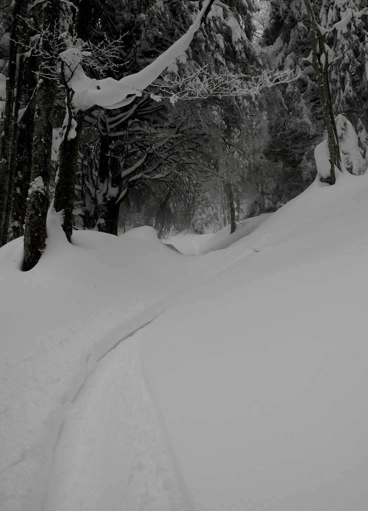Un chemin d'accès bien garni, jamais on ne touche le fond, juste un déchaussage pour passer un court d'eau. A partir de 1000 m, je pense qu'il n'y a plus de problème pour skier en forêt, la couche est suffisante. Dans les champs il y a bien 60 à 70 cm de neige qui est restée relativement légère - pas de travail du vent jusqu'au sommet de Talamarche.