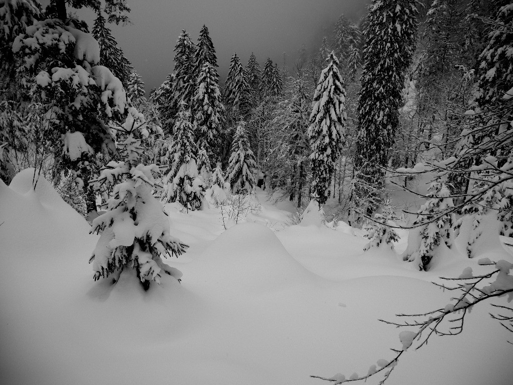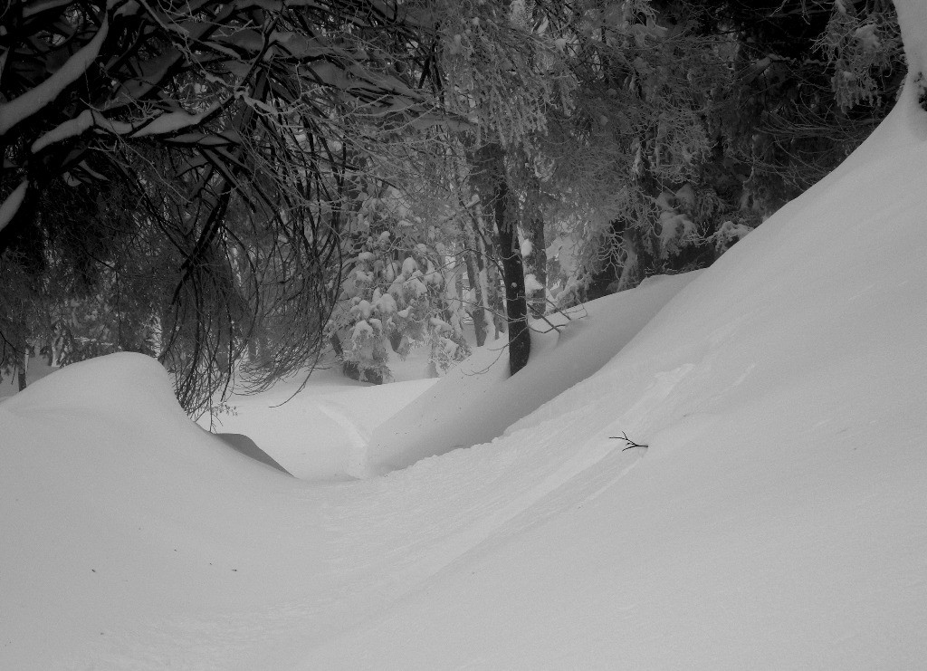 Activité avalancheuse observée : une petite avalanche surprenante dans le lit d'un raide torrent en montant dans la forêt. Sinon rien vu, mais j'ai privilégié les pentes peu raides et garnies de pins.
