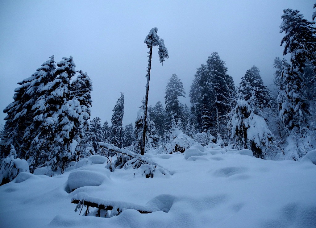 visibilité correcte ... dans la forêtEtat de la route : déneigée. Se garer &au parking de Villard dessus : vaste parking au milieu du hameau.