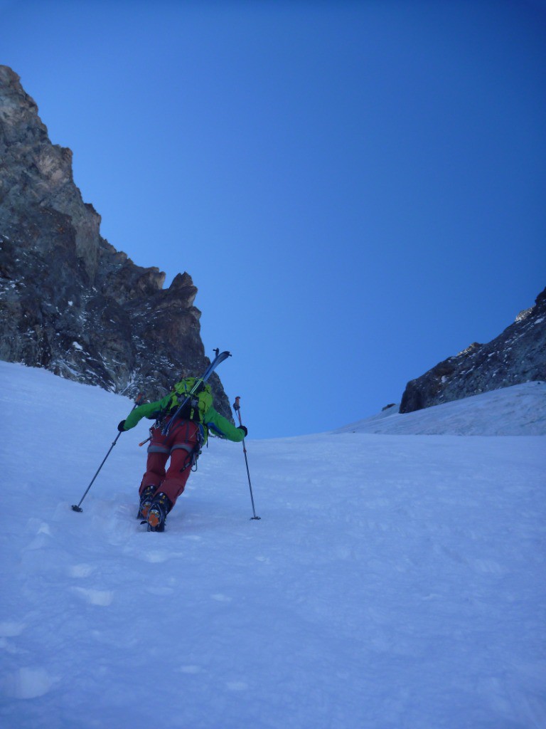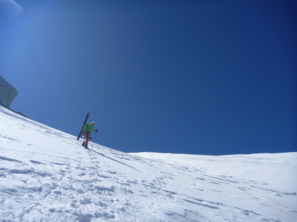 A l'attaque du glacier on zig zag en cherchant les veines dur pour monter peinard, ça brasse un peu de la croute, pas top. Ensuite on rejoint les anciennes traces et ça monte tranquillou, aucun passage en glace ni en pointes avant.