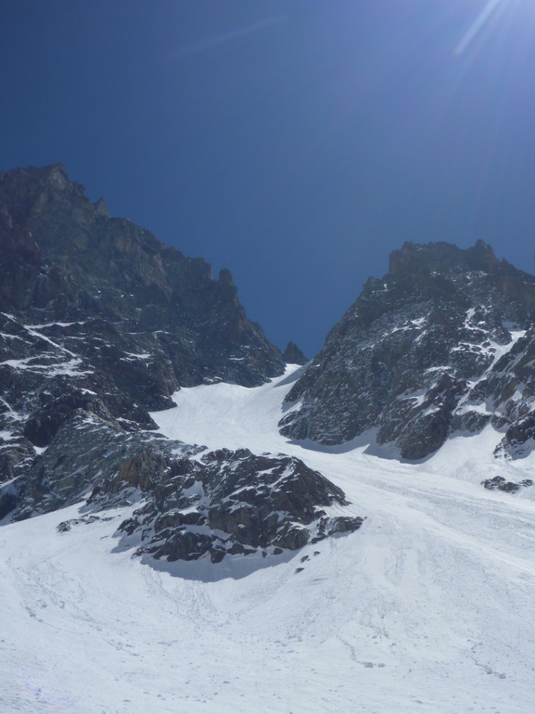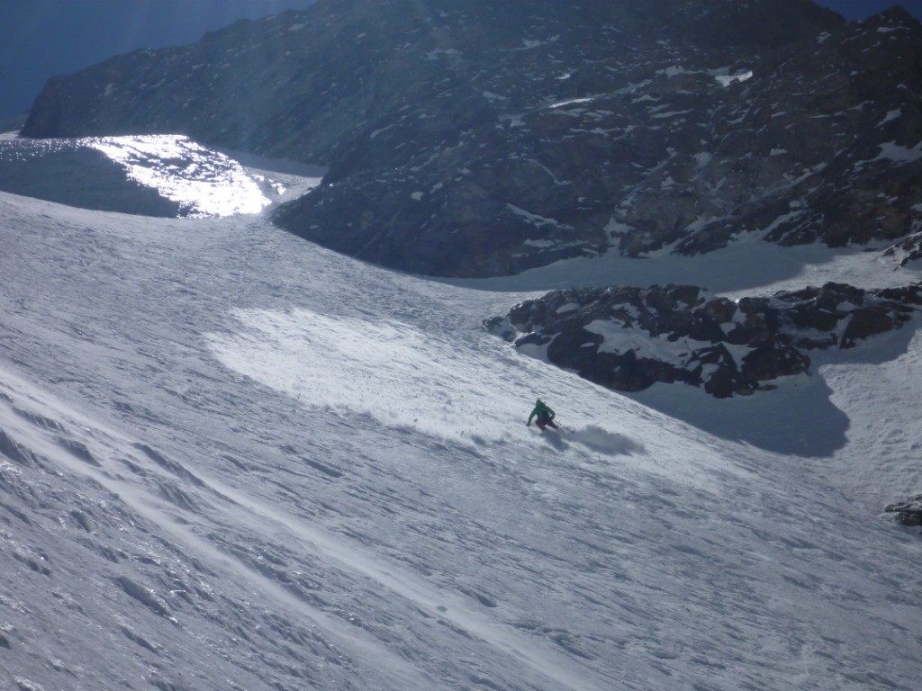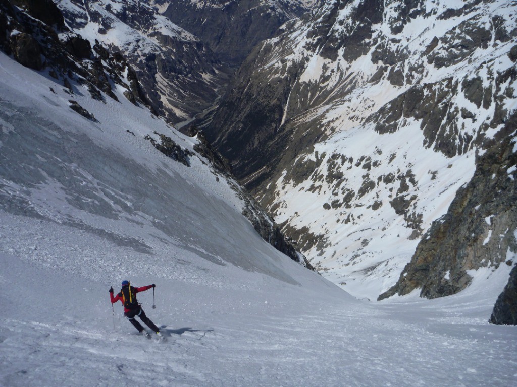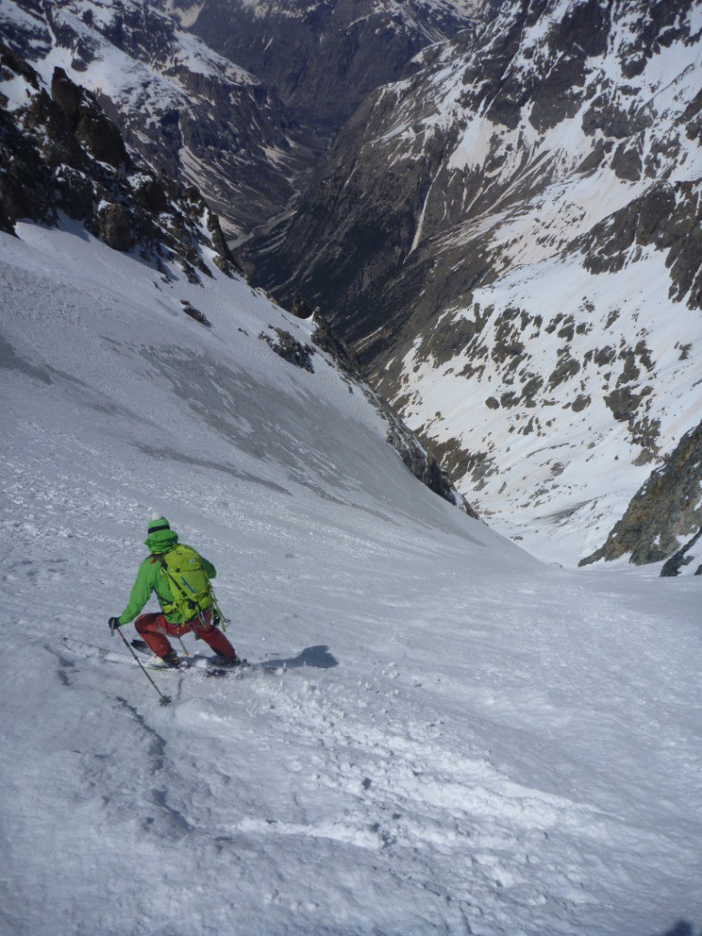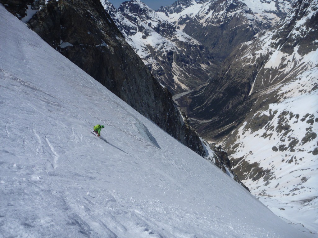 Le soleil atteint le sommet du couloir vers 11h30 environ, et le bas une heure plus tard. Arrivés au sommet vers 12h30, on a failli commencer la descente mais on a finalement fait une sieste au sommet en attendant que ça décaille, bien nous en a pris. Départ vers 13h40 du sommet, c'est revenu juste comme il faut. Bon grip dans le haut, et ça déroule nickel après le crux, la croute dégelée ferait presque penser à de la poudreuse, au top ! Ravin ramolli à point, moquette jusqu'aux baskets en bas !