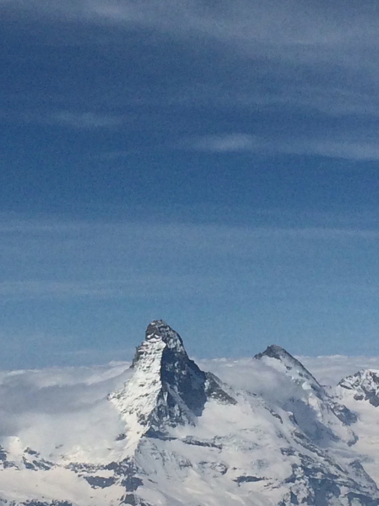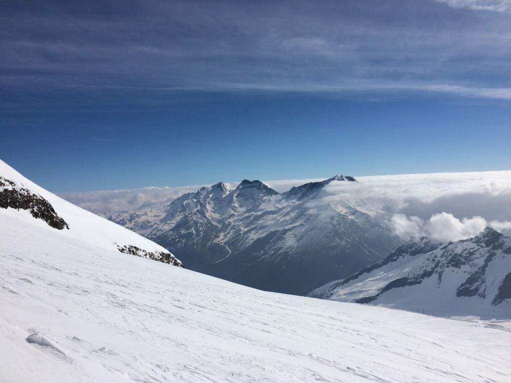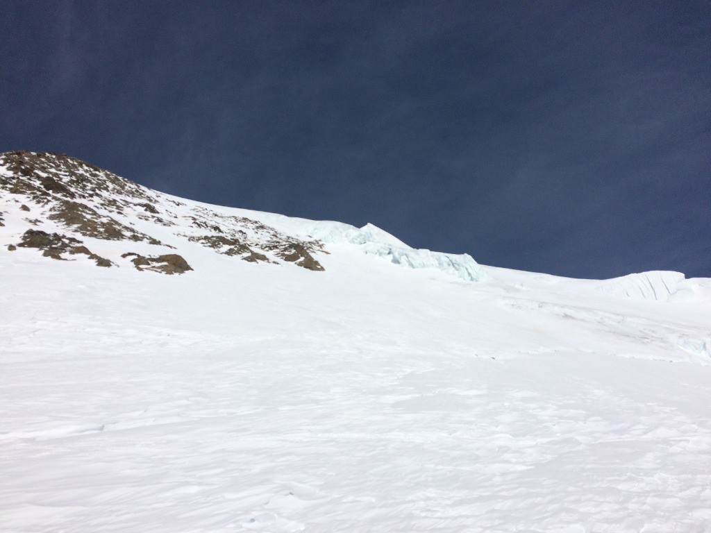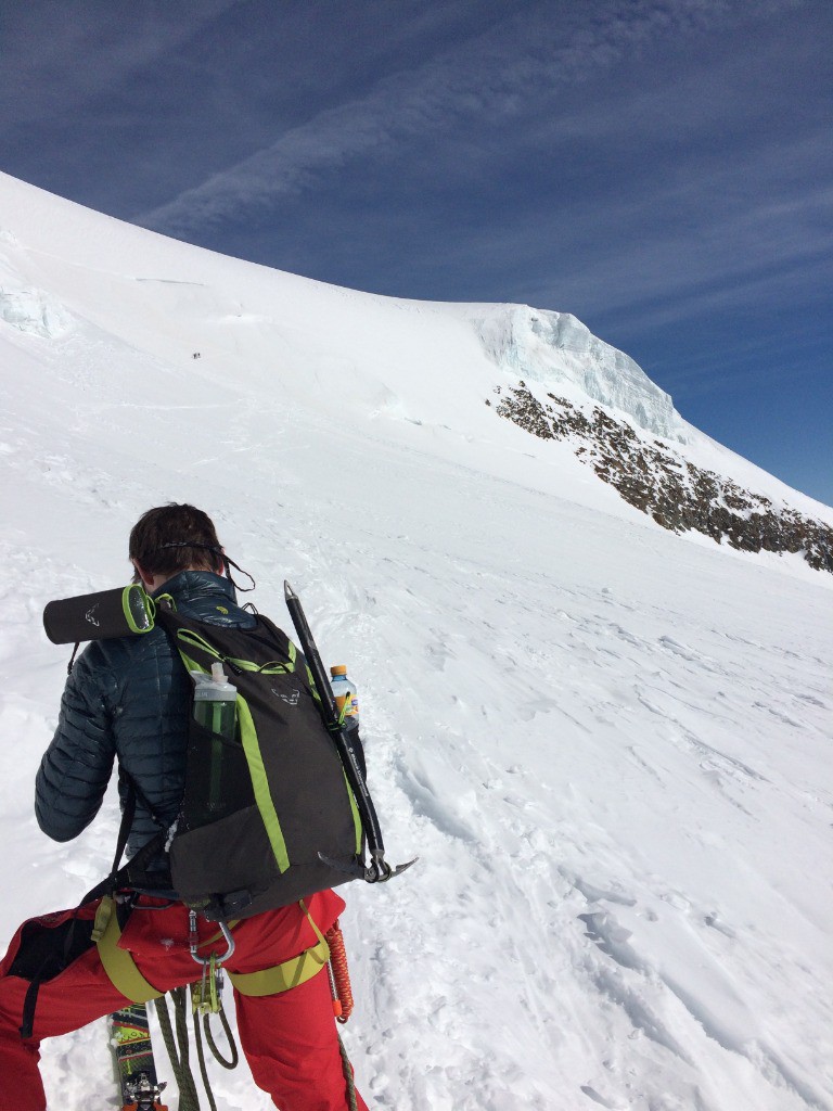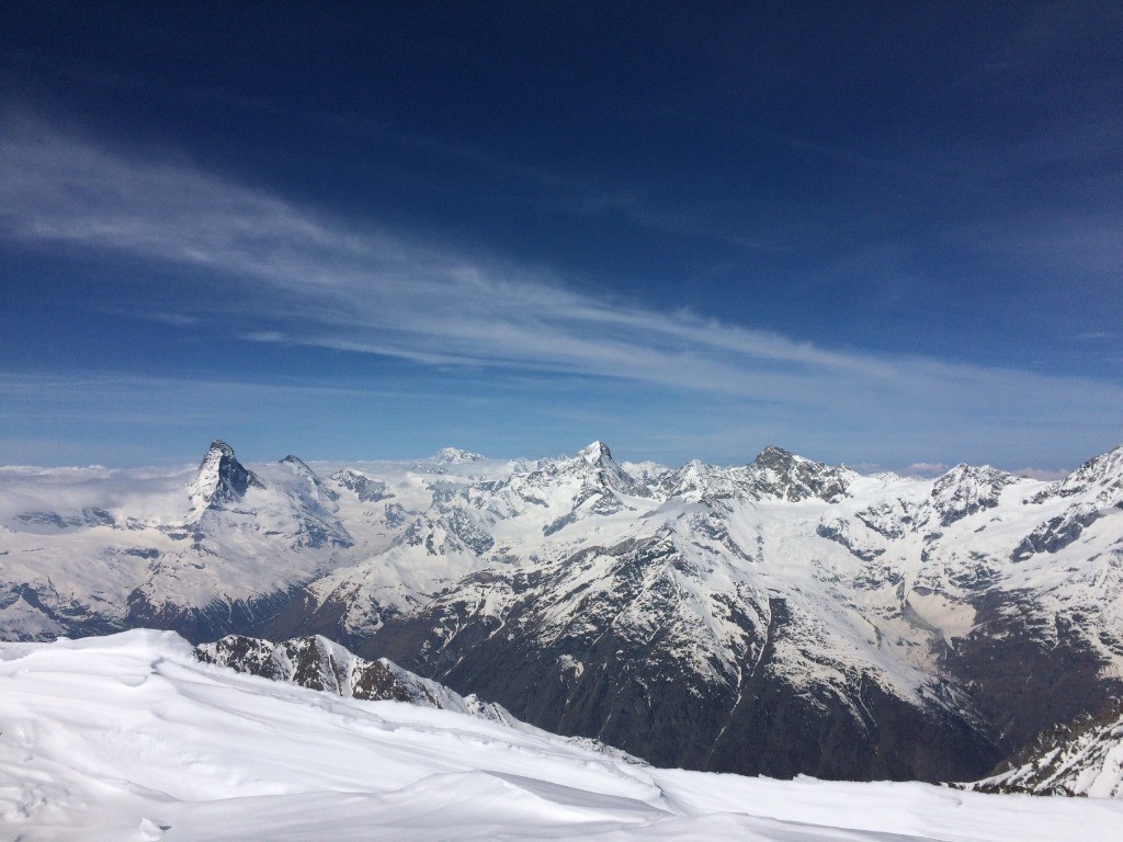 Après une petite pause au sommet qui nous a permis de réviser tous les 4000m de la région (et plus loin) nous redescendons dans une neige variable. On tire à gauche pour rejoindre la descente du Rimpfishhorn afin d'éviter la cabane et garder les skis le plus longtemps possible.
