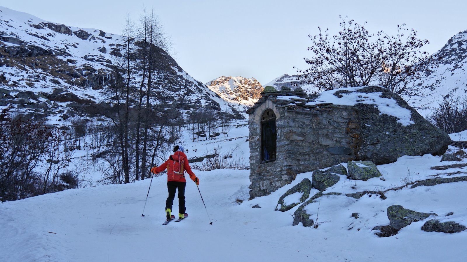5 heures du matin : coup de fil de Christian «départ à 6 heures pour Bonneval sur Arc, ça te dit ? ».... Une telle proposition ne se refuse pas et deux heures plus tard, nous voici donc, skis aux pieds et bien emmitouflés sur le parking enneigé (!) de Bonneval, avec idée d'aller se balader du côté de la Grande Aiguille Rousse. Le contraste entre les deux rives de l'Arc, qui n'est que torrent à cette altitude, est frappant : pentes herbeuses et éboulis de la rive droite contrastent avec les cascades gelées des ruisseaux de la rive gauche, bien enneigée.