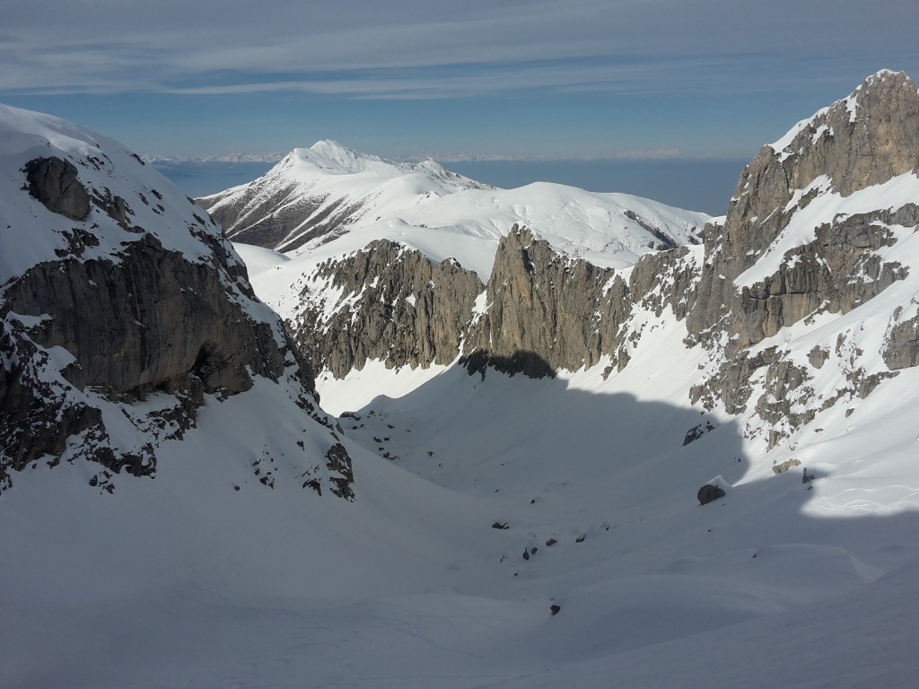 J3: départ du refuge vers 8h30 et 3 heures plus tard, nous nous dressons au sommet de la cima Marguareis, point culminant du massif et de notre raid. Nous longeons l'arête S sur 100m puis plongeons dans la face W, en neige dure. Puis longue traversée descendante jusqu'à Plan Ambreuge. Pour éviter une longue traversée horizontale, nous remontons à la punta Straldi. Et enfin, dernière montée à la cima della Fascia en passant par l'arête S (quelques conversions délicates sous la cima del Serpentera puis facile). Dernière descente avec un petit couloir un peu raide donnant accès au magnifique vallon del Cros, coincé entre les falaises. Un peu de poudre lourde vers 1600m puis nous descendons une piste type boardercross très ludique. Déchaussage aux premières maisons de Limone Piemonte. En attendant notre train, nous profitons de bières et de gelati bien méritées en terrasse d'un café branché (un peu la honte avec nos chaussures puantes). Retour Grenoble à 22h.