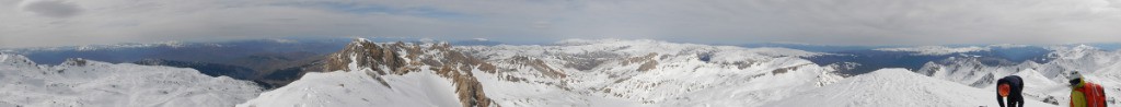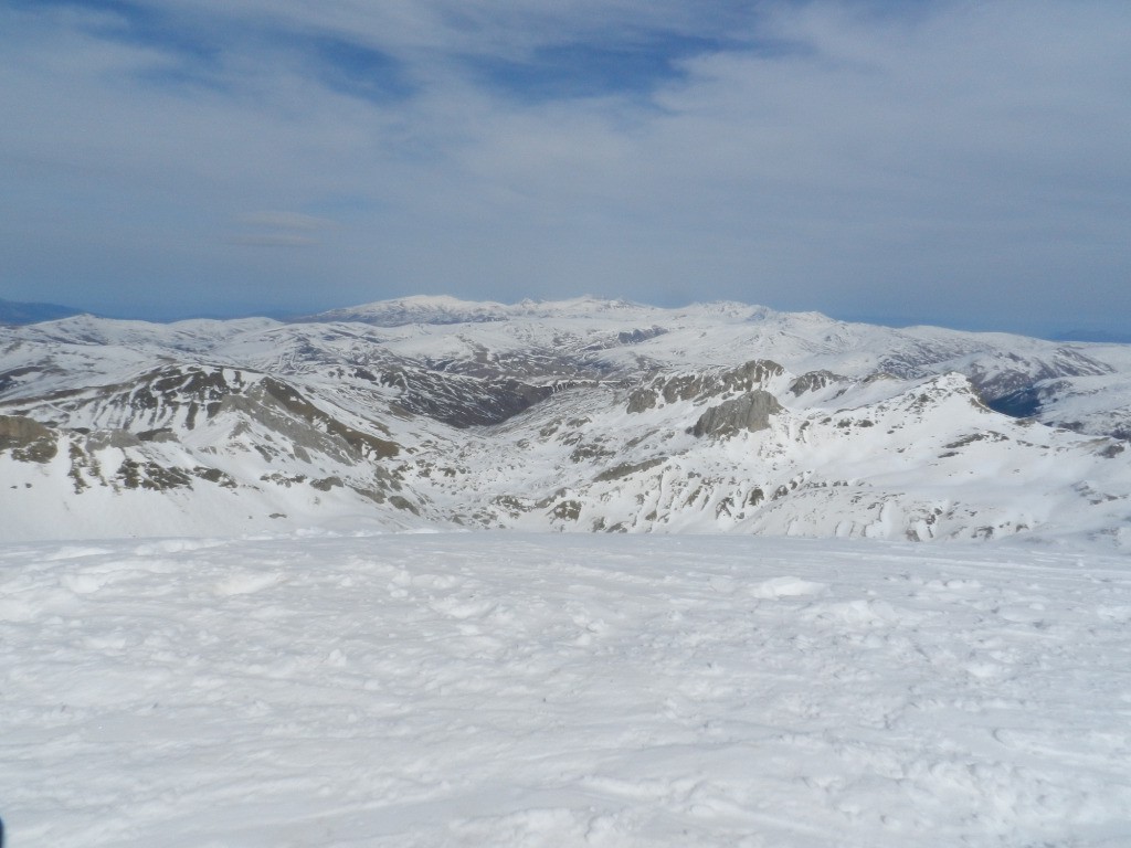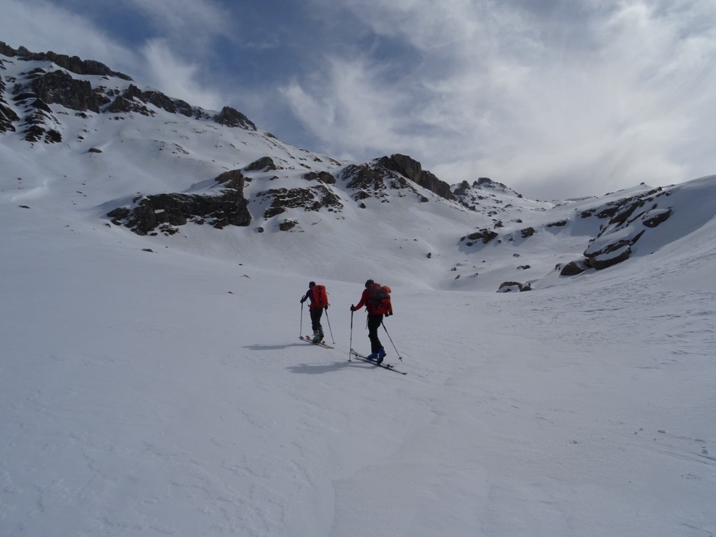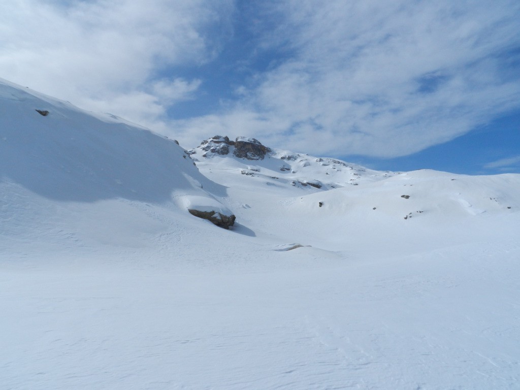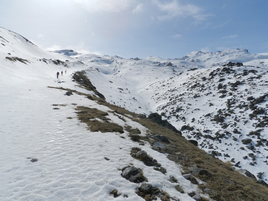 Histoire de ne pas changer nos habitudes, nous démarrons par 500m de portage. La neige est présente en plein nord dès 1300m, sur notre itinéraire, nous la trouverons qu'à 1700m. Nos regards se portent sur des bergeries abandonnées pour l'hiver, des lacs gelés et un long vallon bosselé. Il fait doux mais un désagréable vent du nord nous empêche de bien profiter du soleil. La doudoune sera enlevée et remise une bonne dizaine de fois. Nous arrivons au petit col après 3h d'effort puis au sommet en un peu moins de 4h.