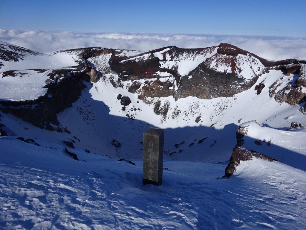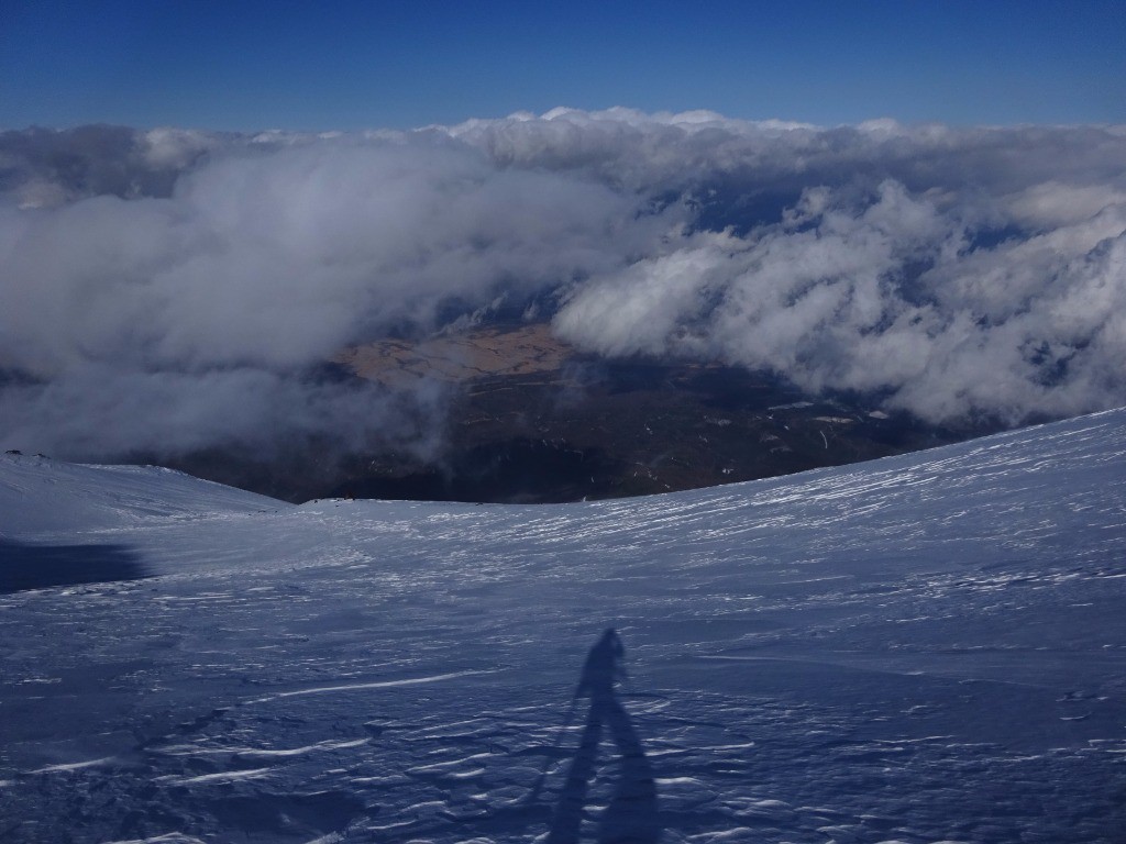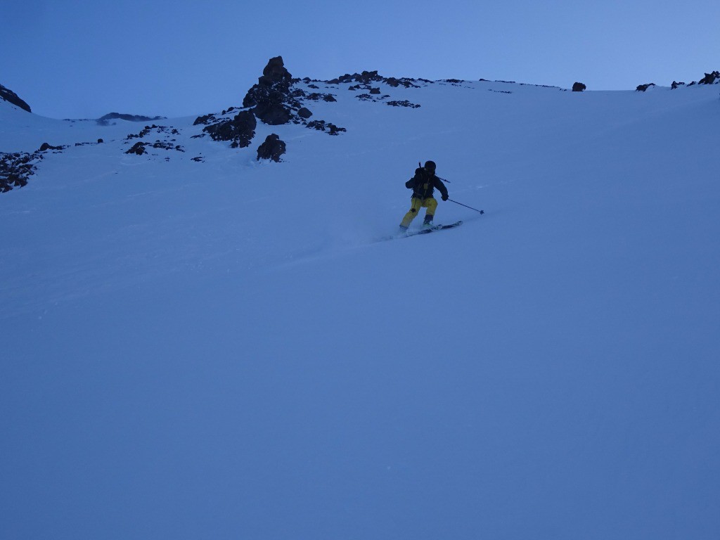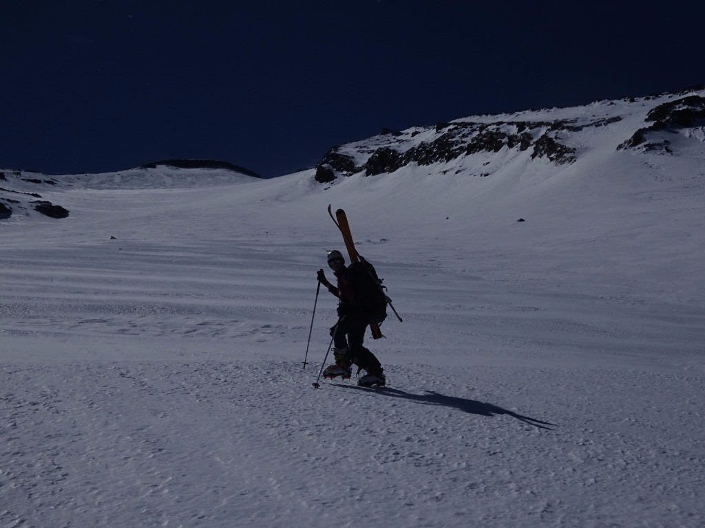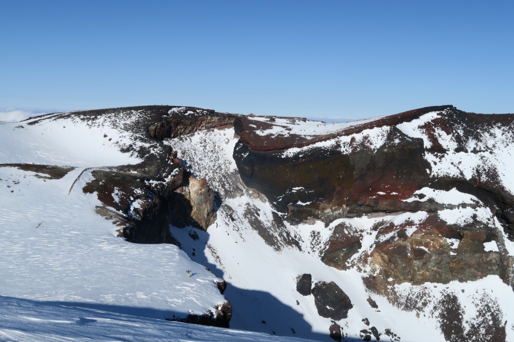 La météo est au beau, le cratère est magnifique avec ses rochers rouges qui surgissent de la neige, on est seul au monde, le vent ne souffle pas si fort par rapport à sa réputation. Feu.