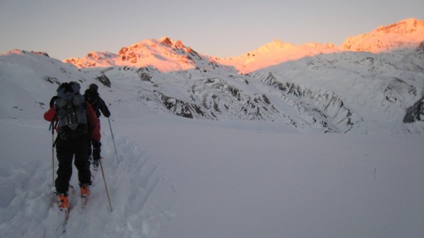 Et pendant ce temps, le soleil se couche, et la neige rosit sous nos skis...On arrivera à la fin du jour et sous la Lune levée au refuge, vide et confort **** dans lequel on passe une super soirée!