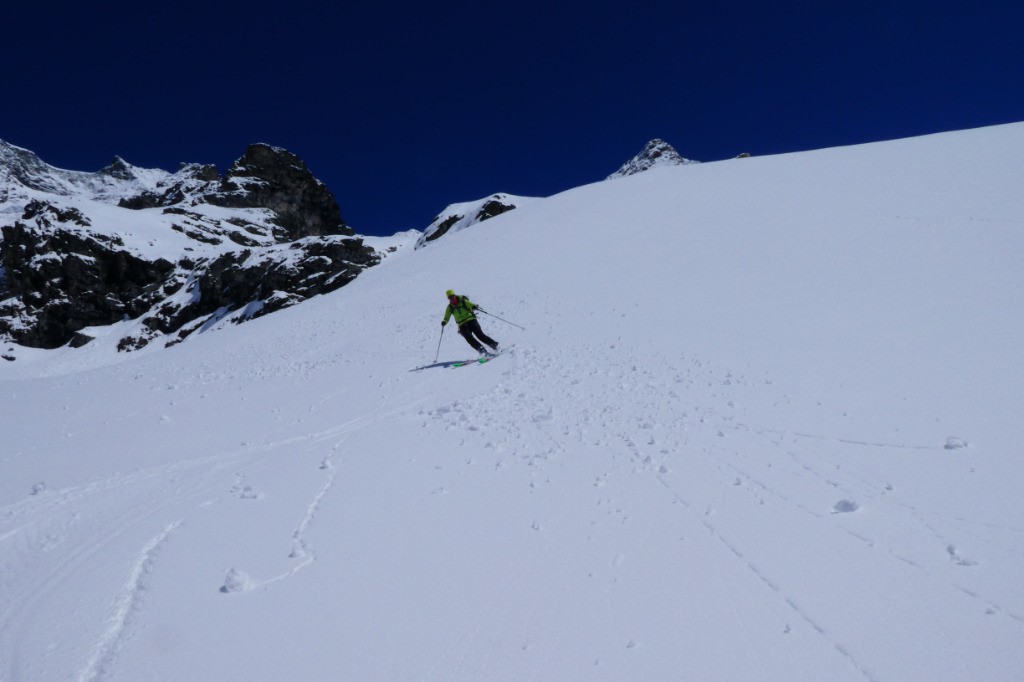 Poudreuse plus ou moins compactée et croutée fin localement du sommet à 3000m, ski 4 à 5*. De 3000m (barre de Séracs) à 2500m petite couche humidifiée sur croute parfois cassante 2 à 3*, 4* sur la moraine et son versant NW. Puis de 2500m à 2200m au mieux avec la faible couche de neige récente posée sur herbe!!