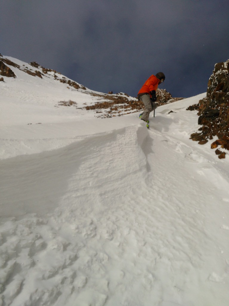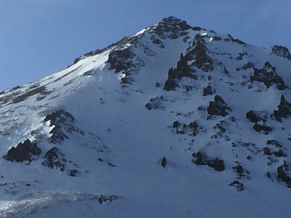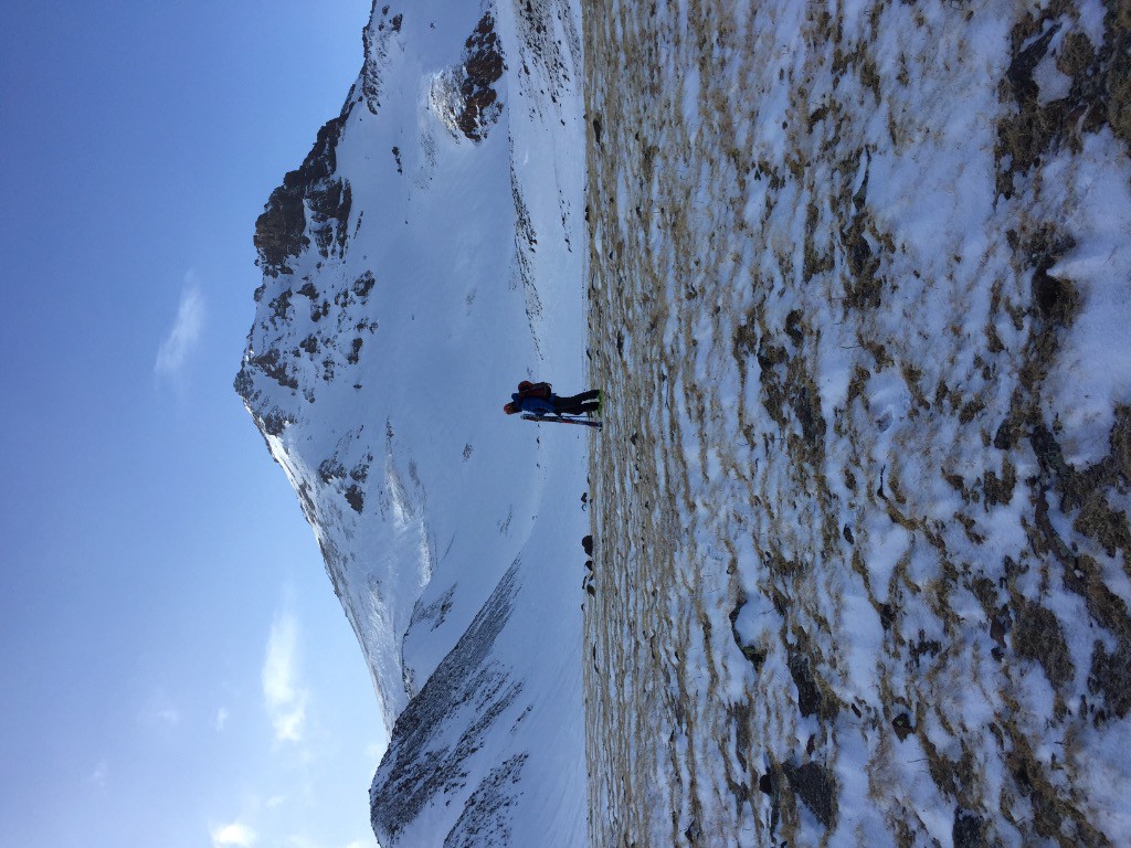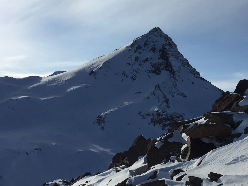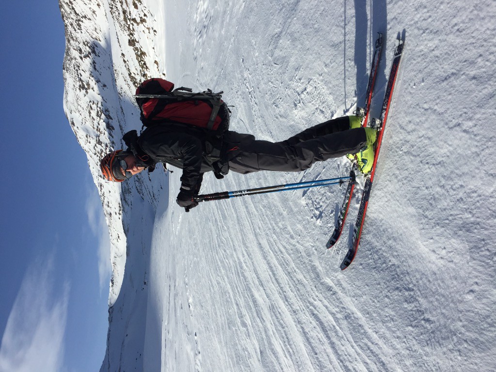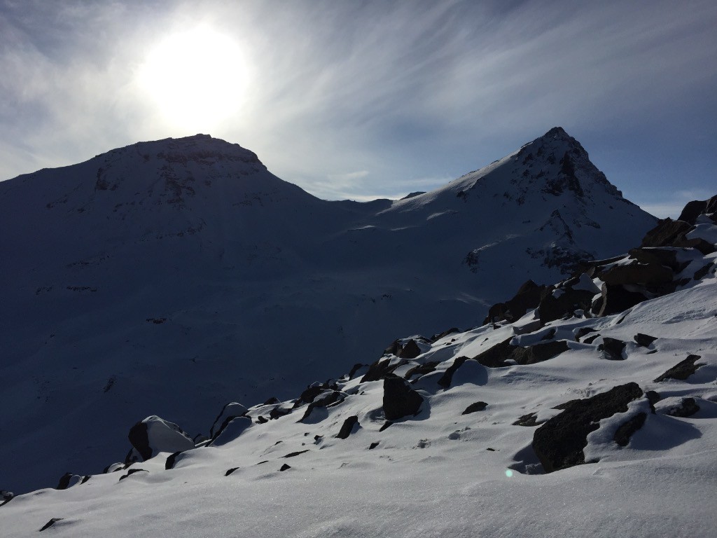 Soleil voilée puis nuageux -vent fort Neige poudre sur les 150 derniers m de dénivelé puis neige dure sur le reste de la descente - pente finale Sud exposée au vent peu enneigée sauf les 150 derniers m