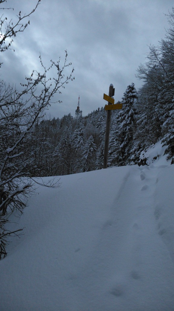 Je me suis arrêté vers 1050m avant la fontaine. La nuit arrivait et il neigeait fort. Plus de 50 cm dans les bois à cette altitude. Si le redoux annoncé demain ne fait pas trop de dégât ça va être tout bon (avis aux amateurs)