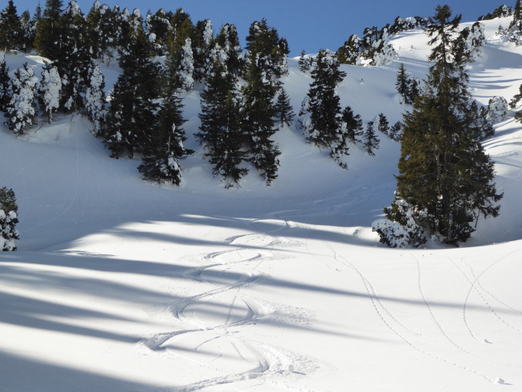Banettes alternance de neige dure soufflée sur les crêtes, et poudre. Lorzier, Neige transfo lourde agréable à skier.