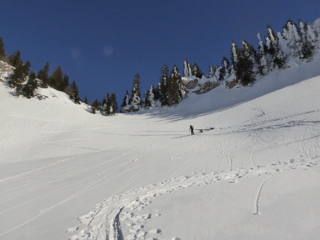 Pas de la biche, nombreux passages mais bonne neige, couloir bien rempli, bonne descente.