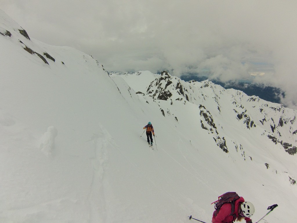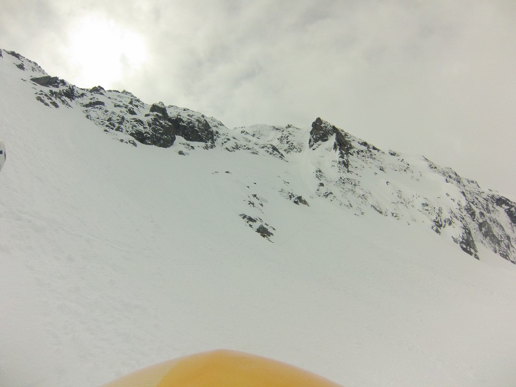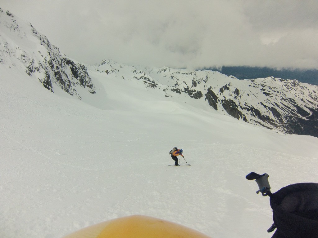 Descente : debut avec poudre très tassée à croutée. Passages en neige très dure. Transition en croute, puis excellente neige de printemps bien revenue.