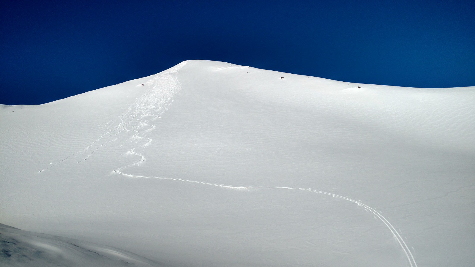 Activité avalancheuse observée : une bonne reptation à 2450m sous l'Homme Cairn à droite. En versant E au dessus de 2500m, un peu de travail du vent (neige un peu densifiée ou poudre un peu lourde, difficile de savoir. J'éviterais les grandes pentes E sous le sommet pour quelques jours encore). Aux alentours, des coulées en W et N dans les pentes raides. Des reptations dans les zones raides sud vers le Mirandi. Pas de soucis sur notre itinéraire sinon.